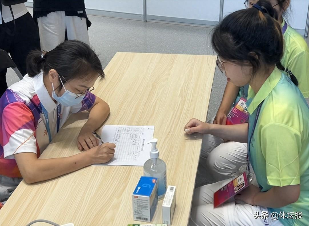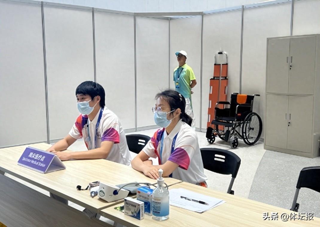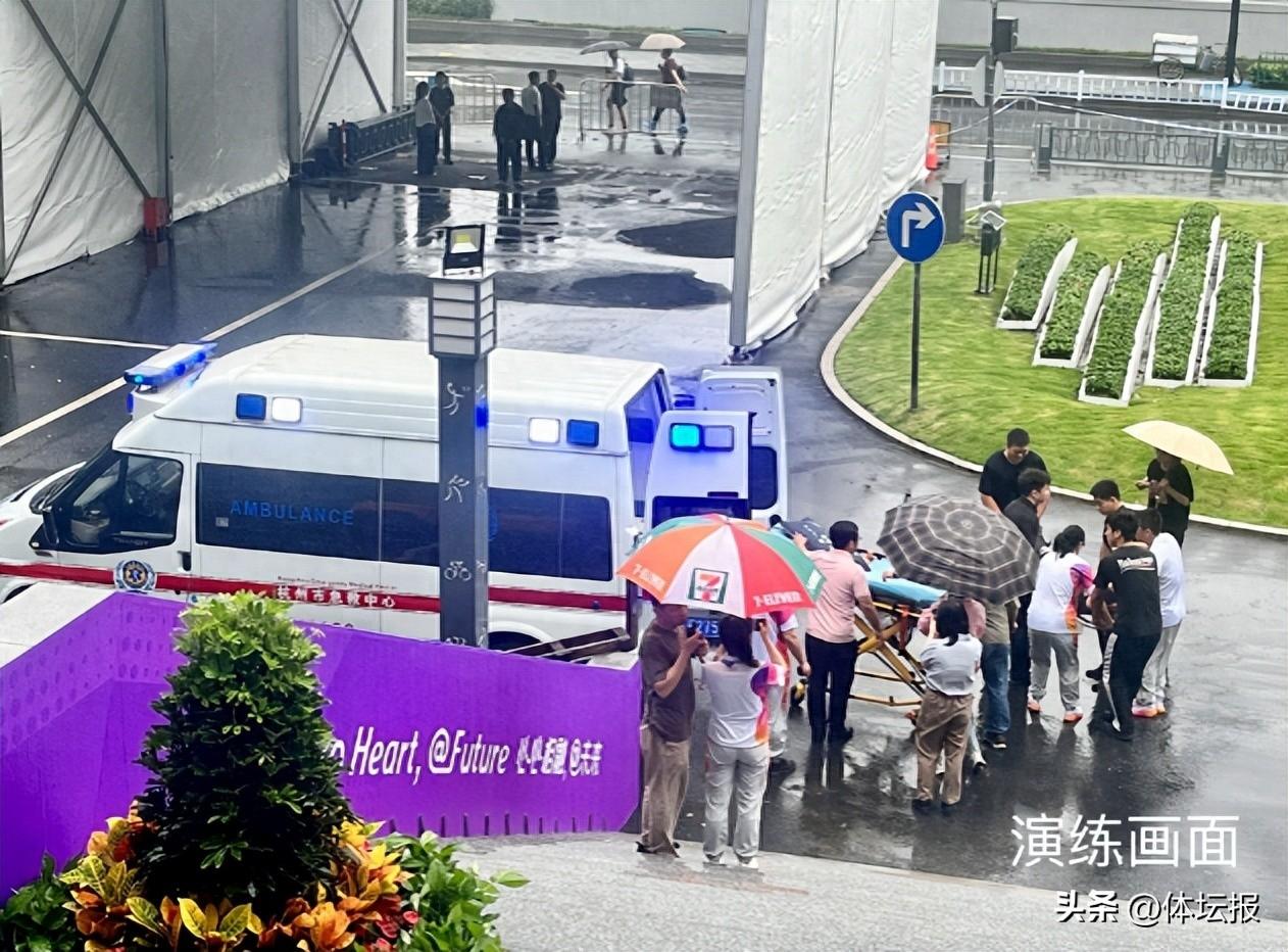 上午10時,場館醫療領域“接到”工作人員中暑情況後立即報告場館運行辦公室,場館指揮部隨即向賽事總指揮部發起視頻連線,第一時間上報。場館人事/志願領域啓動人員應急調配程序,確保賽事不受影響,醫療領域第一時間開展現場“救治”。救護車到達後,觀衆醫療點醫護人員第一時間向急救人員提供了“患者”的體徵數據及身份信息,安保人員及志願者開展現場秩序維護,爲轉運人員提供通行便利,確保全過程流暢、迅速、有序。記者計時發現,將“重症患者”從觀衆醫療點轉移至救護車,該過程用時不到5分鐘。