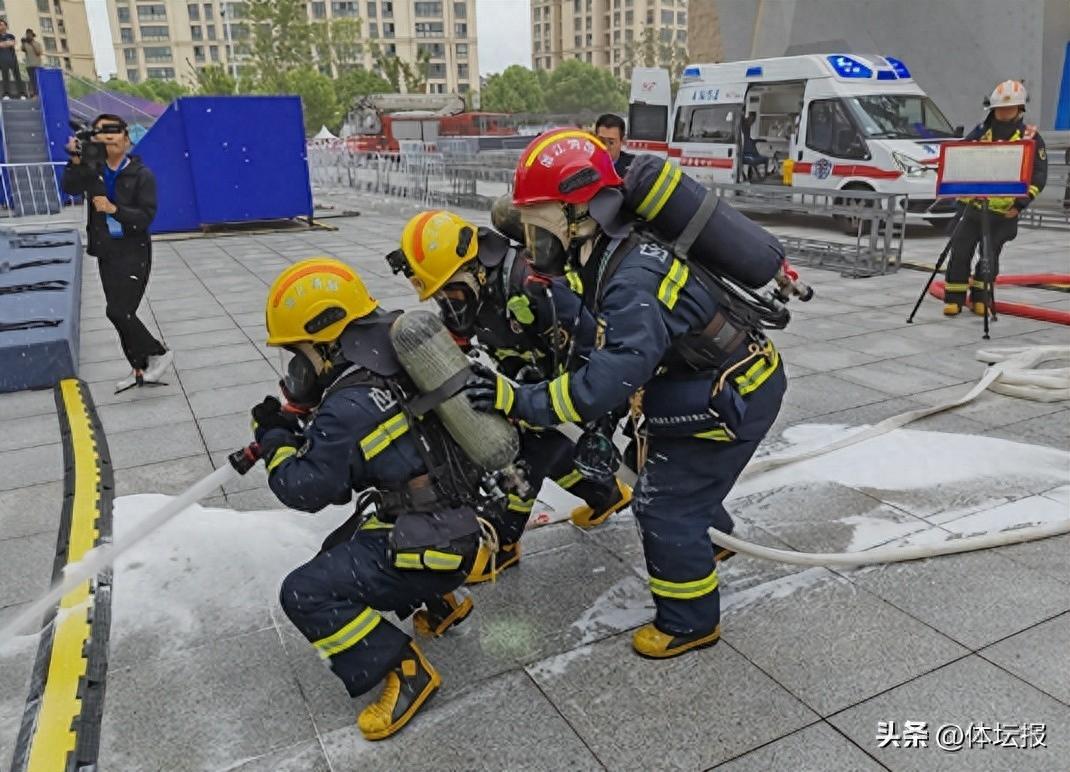 “比賽”期間,場館內突然發生了一起“緊急情況”,一股不明的煙霧從看臺下方瀰漫開來,現場還有“傷員”昏迷不醒。不到30秒,在場館待命的消防車以及救護車立即出動,消防隊員們裝備整齊,醫護人員嚴陣以待,立即對現場情況進行研判,對出現的“火勢”以及“傷者”進行快速處置。與此同時,看臺上的觀衆們也按照既定路線有序疏散。不到十分鐘,這個“突發事件”得以平息。