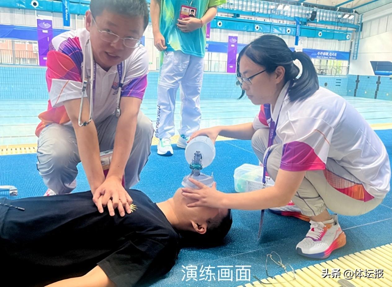 “急救”完成後,“受傷運動員”被成功送往樓下的救護車,“救護行動”順利告一段落。杭州游泳健身館醫療衛生組主管佔德華告訴記者,從2019年開始,整個場館的醫療保障團隊就一直在進行着小範圍演練,在熟悉急救流程、保障醫療器械、志願者培訓等方面進行不斷加強完善,“通過多次反覆的演練,現在我們可以完成基本在十分鐘內將受傷者進行緊急救護,並送上救護車的流程。”