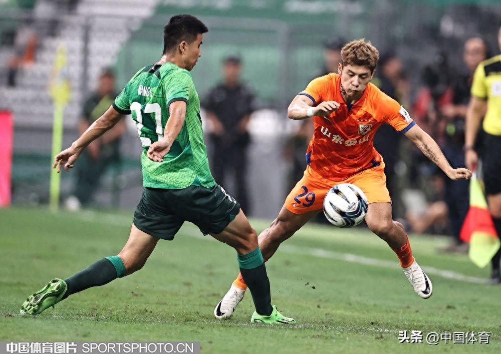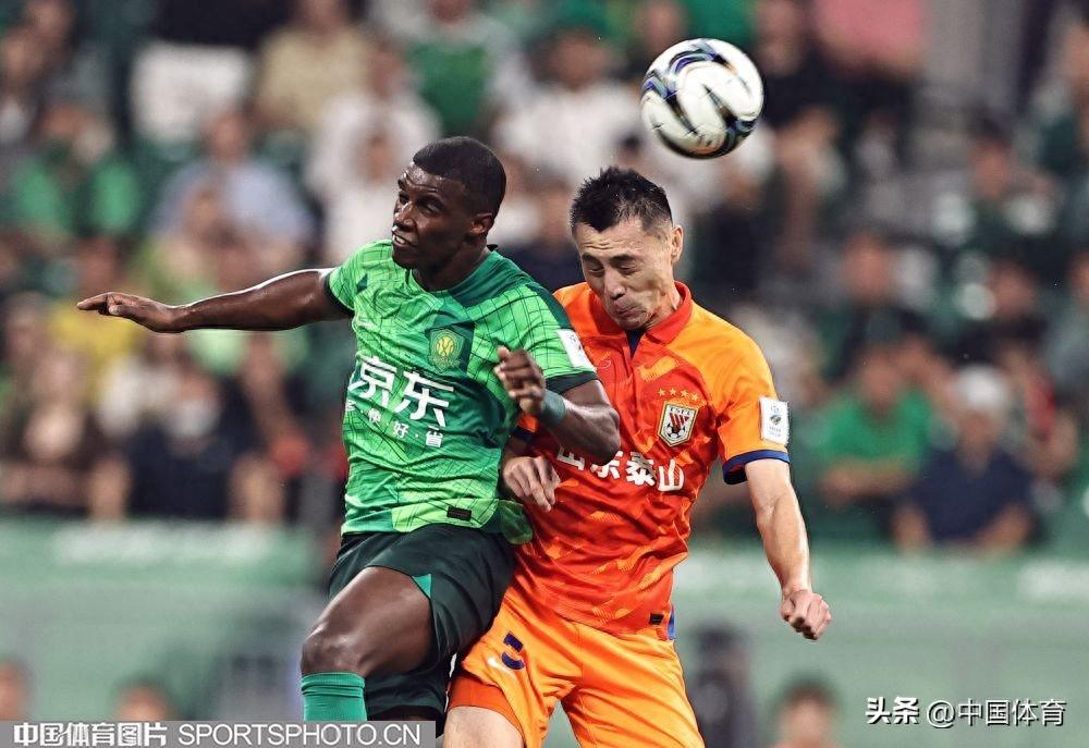 中國體育訊 8月31日晚,2023賽季中國足協盃1/4決賽的一場焦點戰在北京工人體育場打響,北京國安隊(綠衣)迎來山東泰山隊(橙衣)的挑戰。上半場,陳蒲頭球空門助力泰山隊領先,隨後國安隊姜祥佑快速反擊還以顏色。下半場,雙方均未攻破對方球門。常規時間結束,場上比分1比1平。加時賽,雙方仍無建樹,不得不通過點球決定勝負。泰山隊五輪點球全部打進,國安隊則射失一球。最終泰山隊以6比5戰勝國安,晉級四強。(中國體育圖片 王憲民 攝)