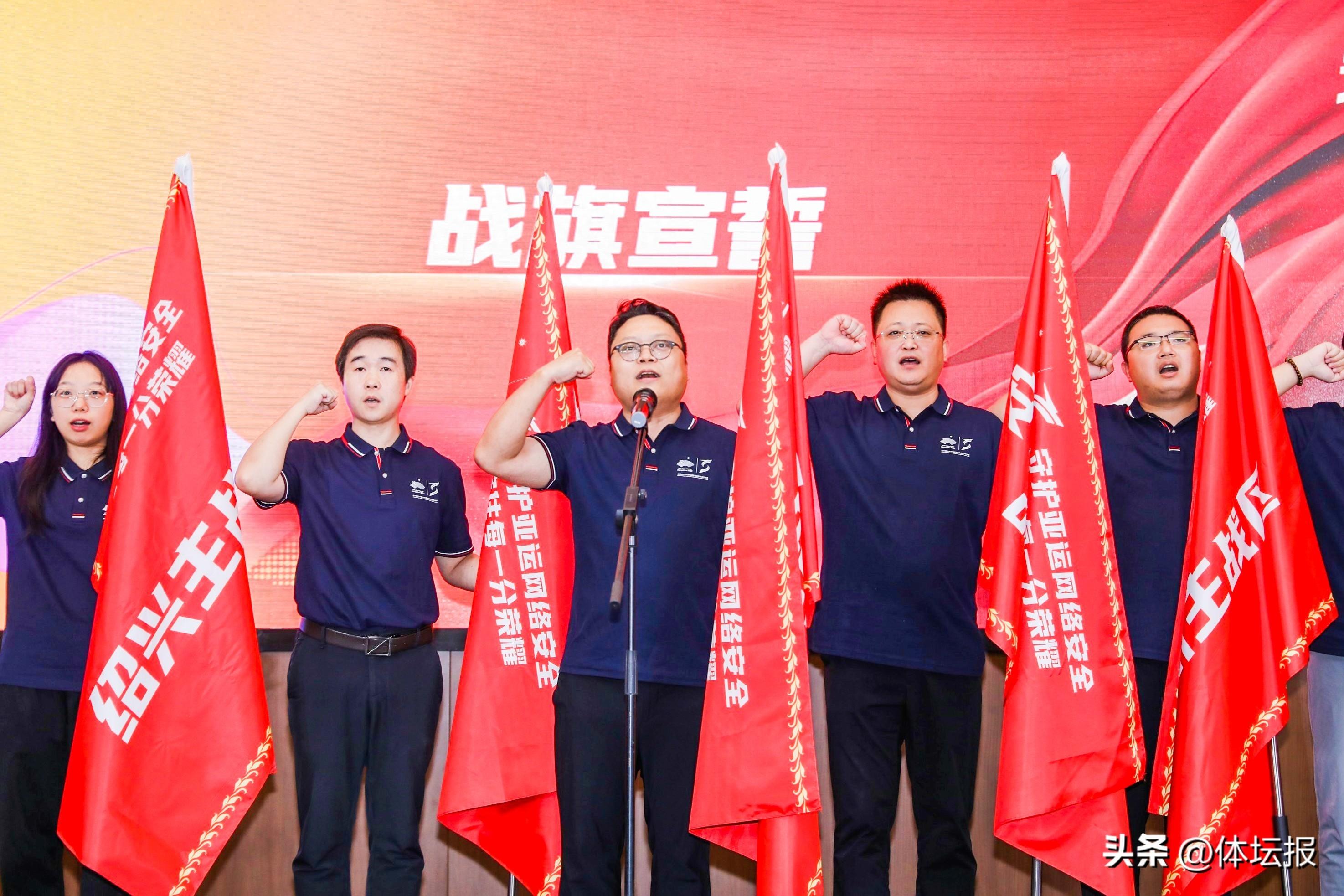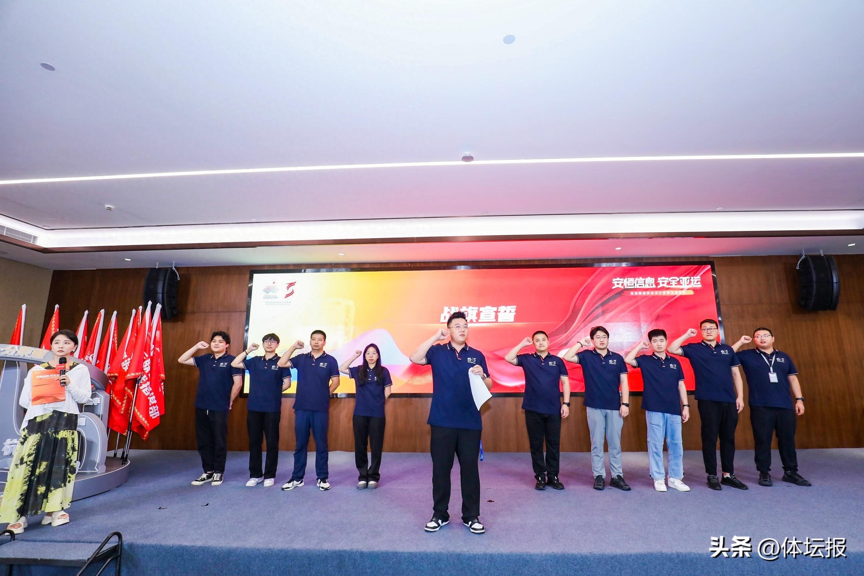 出征儀式上,安恆信息亞運六大主戰區、兩大分戰區的亞運衛士代表分別從亞運聯合作戰指揮中心執行指揮長袁明坤手中接過戰旗,並做出莊嚴承諾:“忠誠履職、勇於擔當,爲保障杭州亞運會網絡安全而不懈奮鬥!”