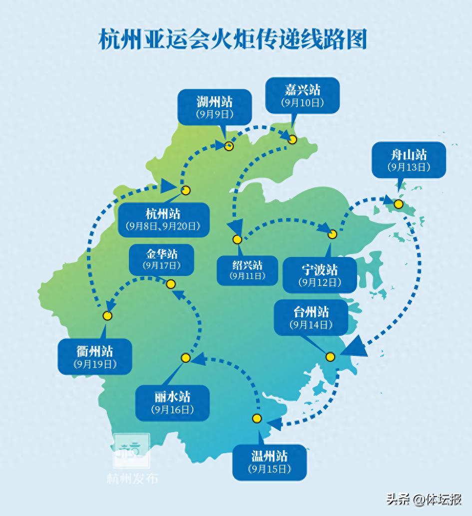 目前,經過近三個月的統籌謀劃和精心籌備,火炬傳遞各項工作已經準備就緒。杭州第19屆亞運會火炬傳遞啓動儀式將於9月8日上午在杭州西湖湧金公園廣場舉行。此後,杭州亞運會火炬將在湖州、嘉興、紹興、寧波、舟山、台州、溫州、麗水、金華、衢州依次傳遞,9月20日回到杭州,並完成最後一站傳遞。