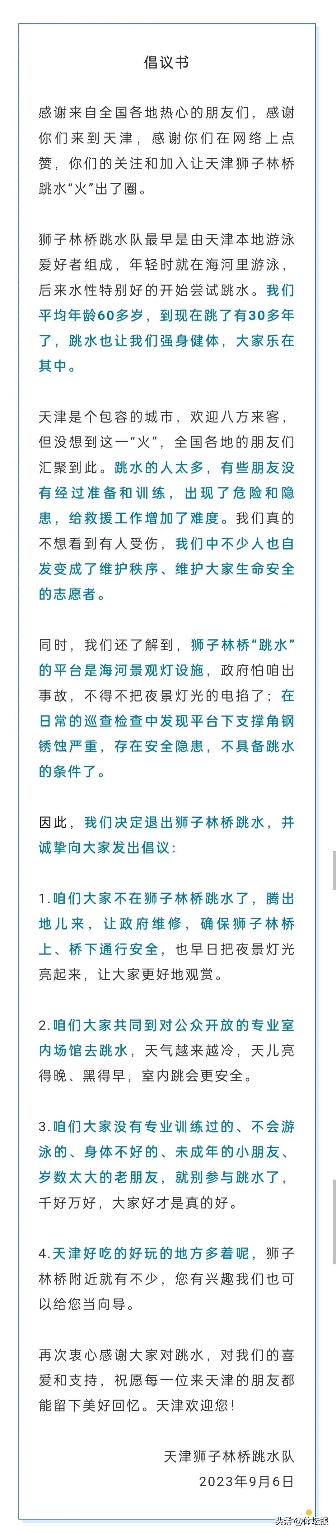 9月6日,天津大爺們決定退出獅子林橋跳水,併發出倡議書,引來無數網友熱議。
