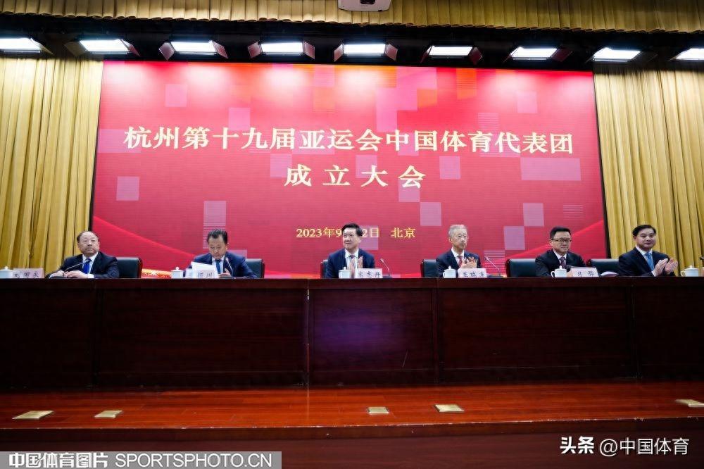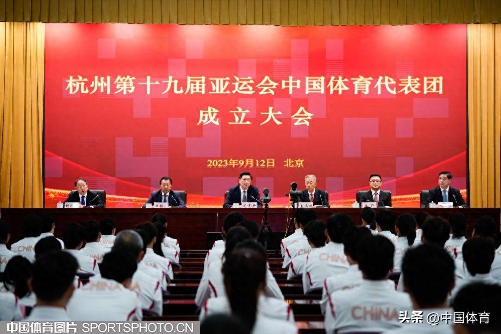 中國體育訊 9月12日,杭州第十九屆亞運會中國代表團成立大會在北京舉行。本屆亞運會將於2023年9月23日至10月8日在浙江杭州舉行,賽會設40個大項、61個分項,產生481枚金牌。中國亞運代表團成員共1329名,其中運動員886人,女運動員437人,男運動員449人,其中包含36名奧運冠軍。(中國體育圖片 魏徵 攝)