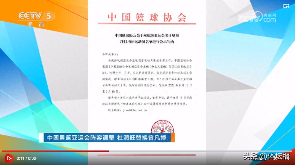 9月13日,中國籃協發佈公告,公示杜潤旺替換曾凡博進入中國男籃亞運會名單。