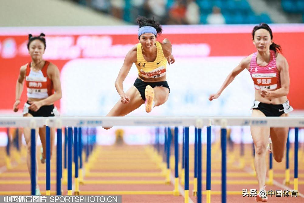 女子成年組100米欄(邀請賽)金牌被福建隊林雨薇以13秒20摘得,廣東隊羅顯彥和福建隊姜李韻喆分獲亞軍和季軍,成績分別爲13秒63和13秒90。(中國體育圖片 鹿麟 攝)