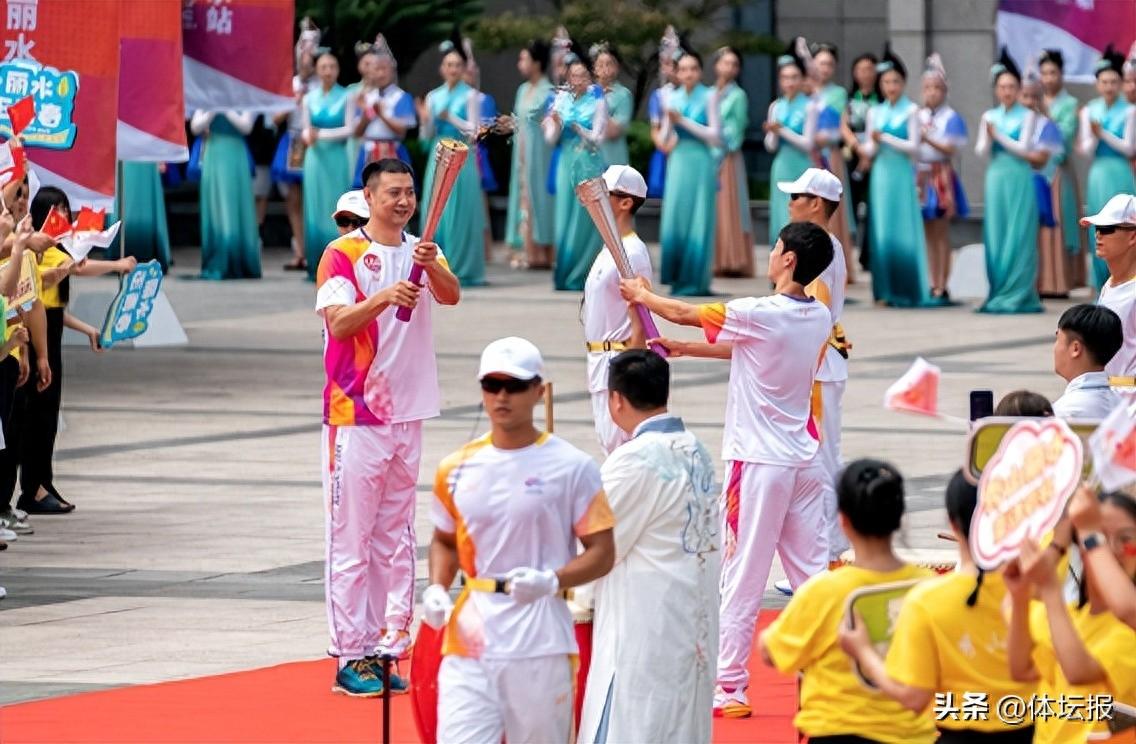 麗水南明湖畔的濱水公園,18歲少年吳路逸從亞運冠軍丁錦輝手中接過亞運聖火,成爲麗水站手擎“薪火”的最後一棒。