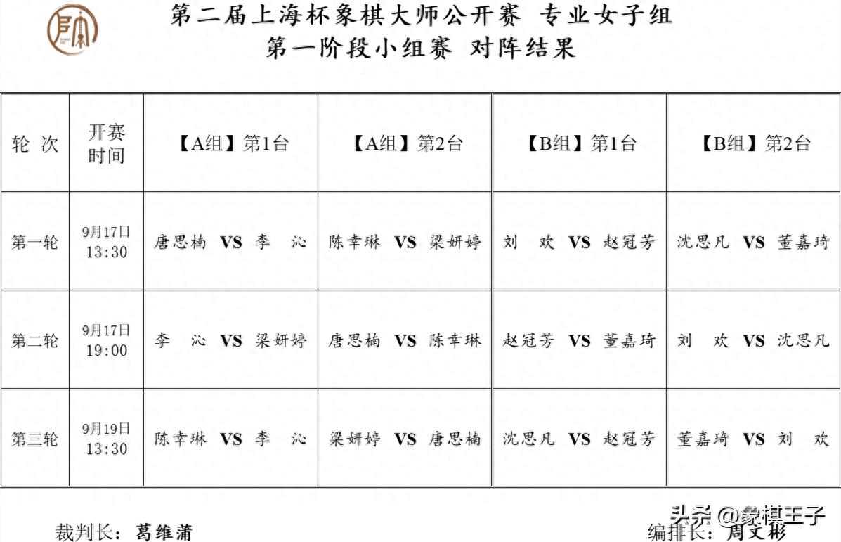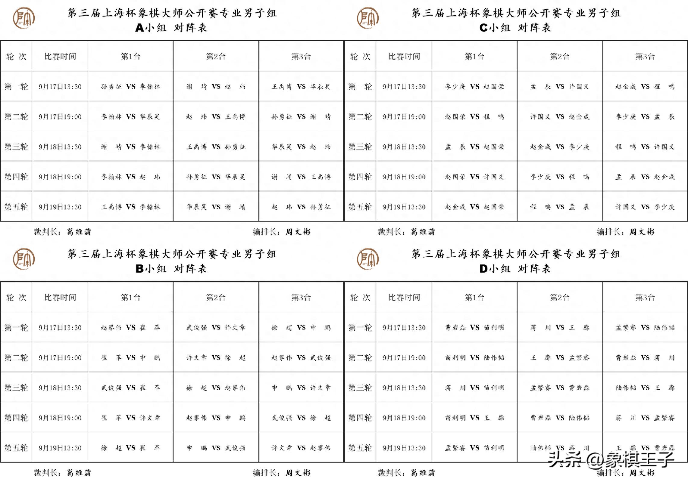 日程9月17至20日,17-19日,每天下午一點半、晚上七點一輪,小組五輪+半決戰,20日下午一點半季軍戰,下午五點總決賽,象棋王子全程直播。