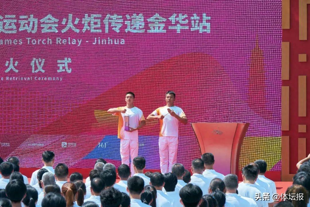 奧運冠軍、浙江體育職業技術學院院長孟關良作爲金華站第一棒火炬手接過亞運火炬,向第二棒選手,國家健將級摩托艇運動員、國家動力衝浪板隊教練林斌跑去。