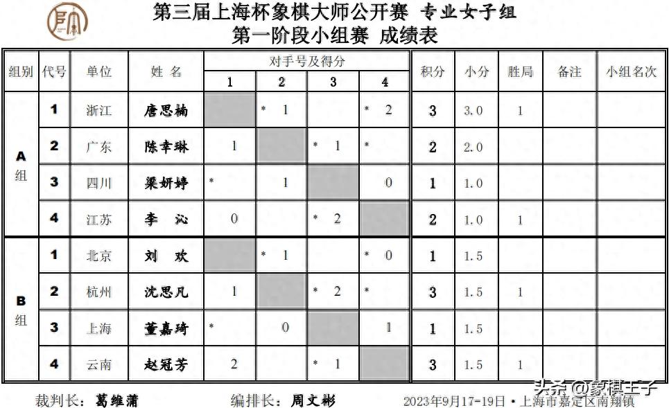 上海杯首日過後,兩場下來,男子積分榜單A組謝靖4,王禹博3,李翰林2,孫勇徵、趙瑋、華辰昊1;B組武俊強、崔革3,徐超、趙攀偉、許文章2,申鵬0。