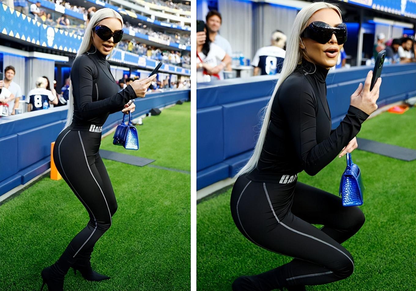 值得一提的是,金姐又習慣性地裹上一身黑色連體衣,身材曲線一目瞭然,極致臀腰比例讓看臺上的球迷也“目不轉睛”,着實有點搶鏡了。