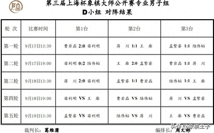 同組曹巖磊戰平孟繁睿,王廓打和陸偉韜,D組三場後,蔣川、王廓、陸偉韜、曹巖磊,四人積4分,積分膠着,出線局勢撲朔迷離,孟繁睿2分,苗利明0分。