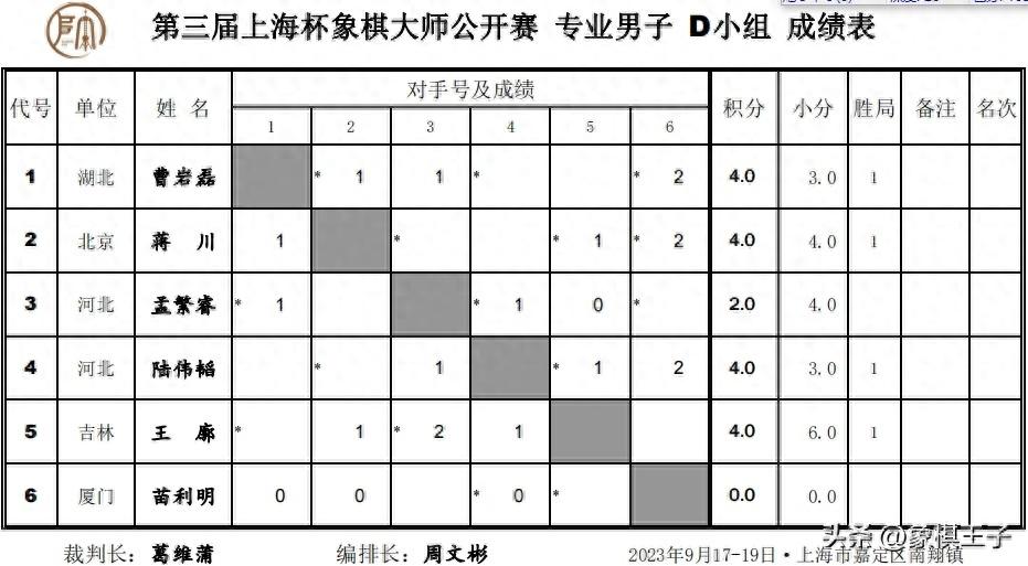 9月18日下午,2023年第三屆上海杯象棋大師公開賽專業組男子比賽第3輪在上海嘉定區南翔古鎮戰罷。蔣川大四兵取勝,D組形勢混亂,謝靖、李少庚三連捷,基本鎖定A、C組,出線在即。象棋王子全程直播。
