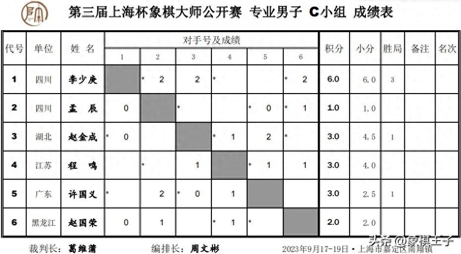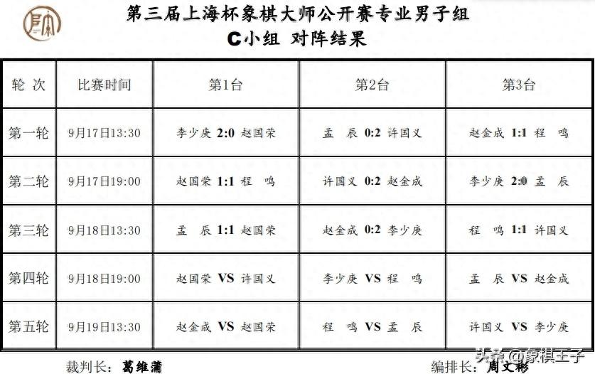 同組另兩盤,孟辰對趙國榮,程鳴對許國義均成和,C組李少庚三勝6分一枝獨秀,趙金成、程鳴、許國義3分,趙國榮2分,孟辰1分。