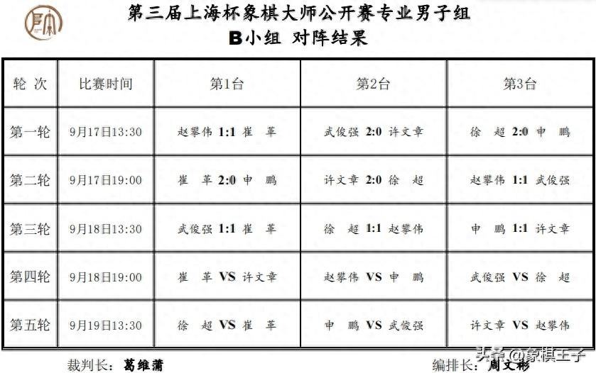 B組,這輪較爲平和,三盤棋均打成平手,武俊強和崔革,徐超和趙攀偉,申鵬和許文章。