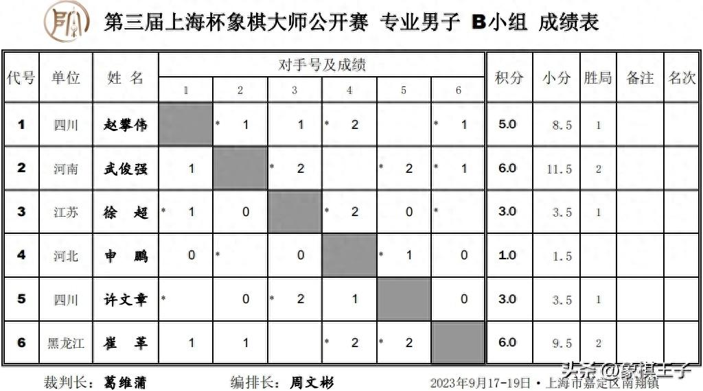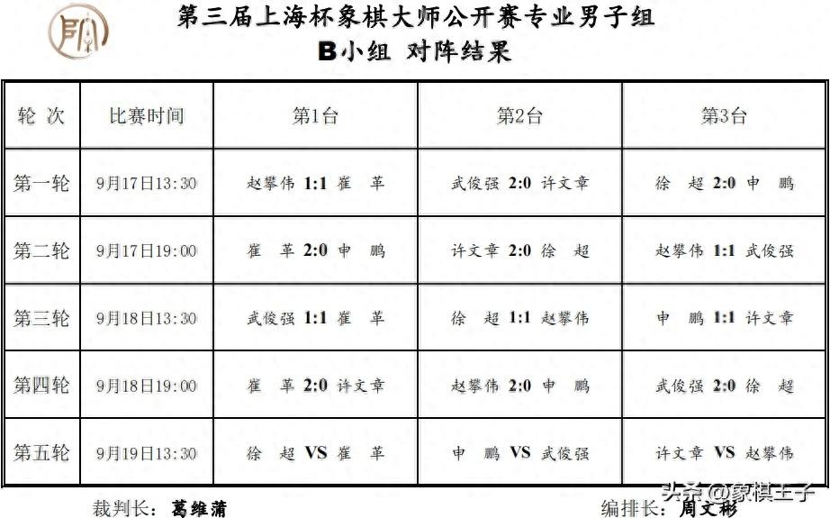 B組裏,頗爲有意思,第三輪全和,第四輪則全部分出了勝負,在第4輪中,崔革取勝許文章,趙攀偉贏下申鵬,武俊強擊敗徐超。