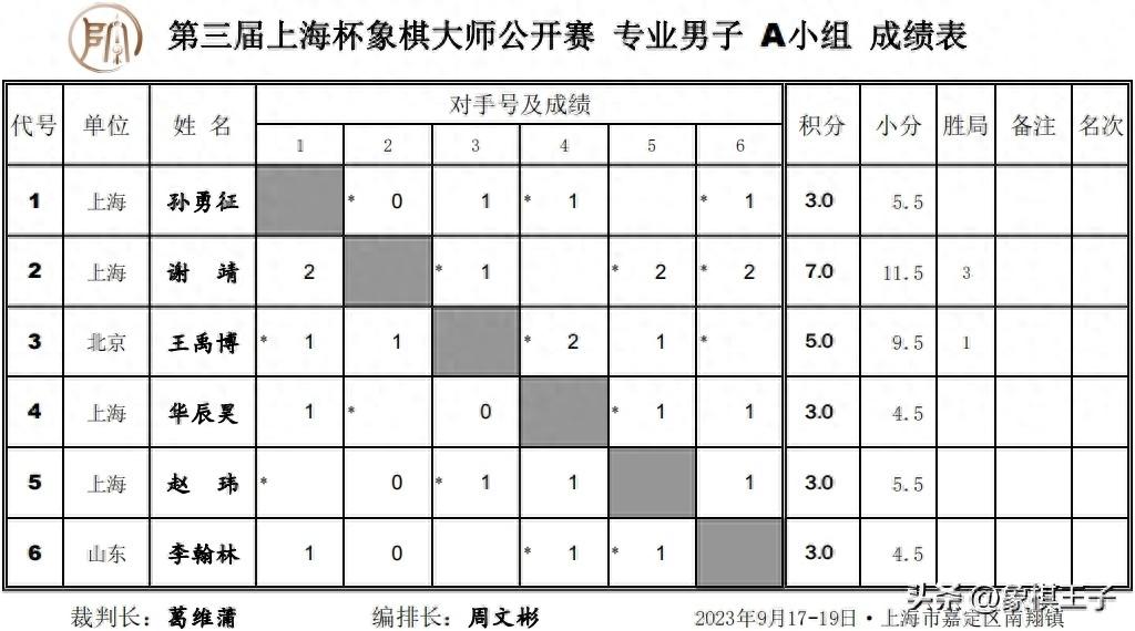 這樣,四輪下來,謝靖四戰三勝一平積7分,小組第一,王禹博5分,孫勇徵、趙瑋、李翰林、華辰昊3分。