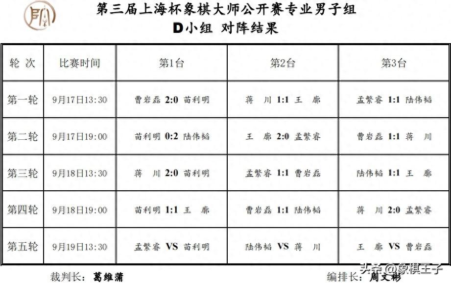 9月18日,2023年第三屆上海杯象棋大師公開賽專業組第二日比賽在上海嘉定區南翔古鎮戰罷。蔣川連勝反超登上小組榜首,A、C組謝靖李少庚常規已突圍,B、D組爭奪激烈。象棋王子全程直播。