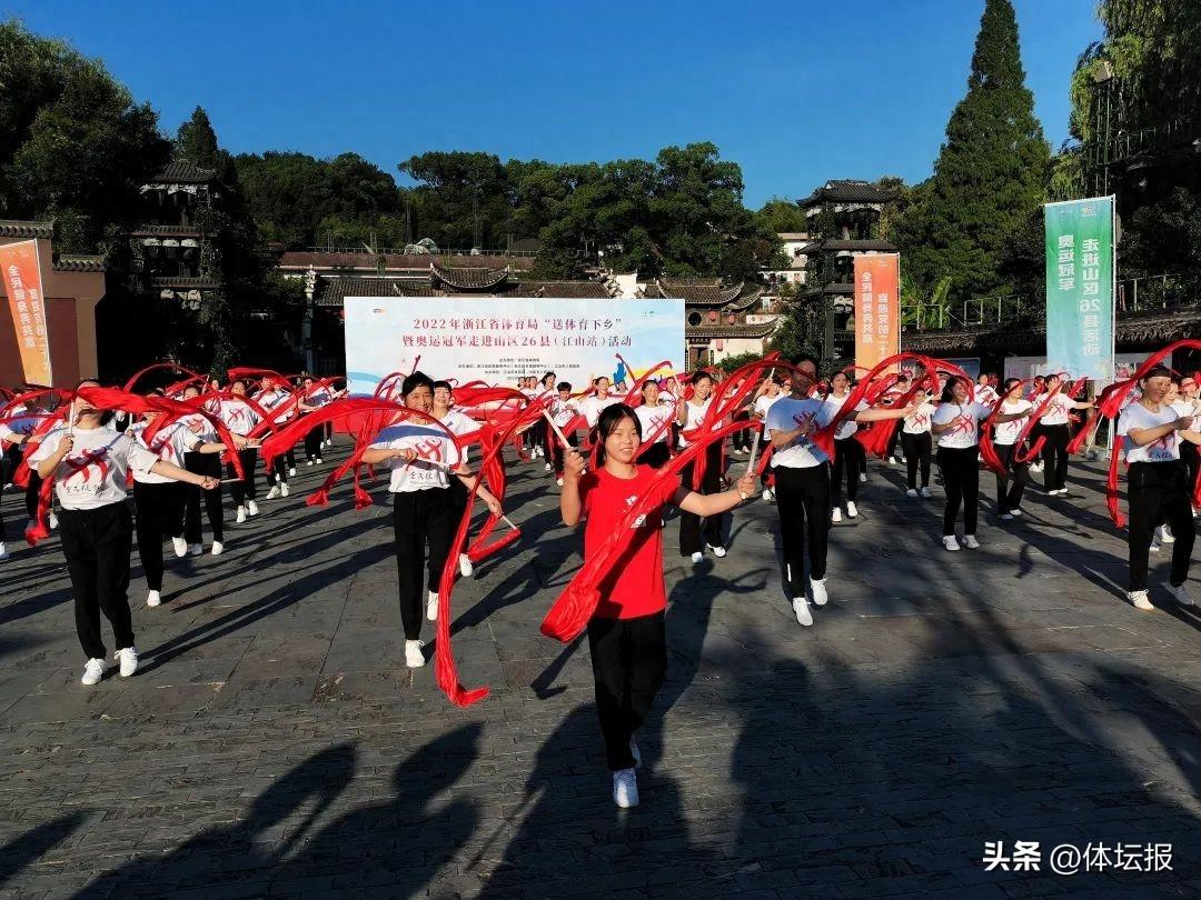 “送體育下鄉”走進山區26縣活動,奧運管晨辰與江山羣衆共舞。