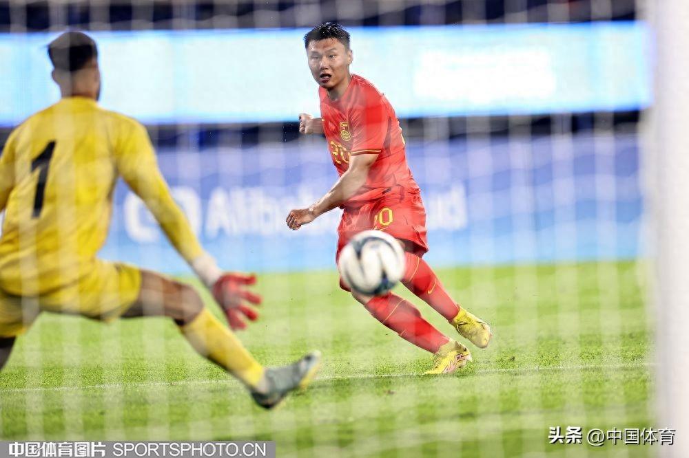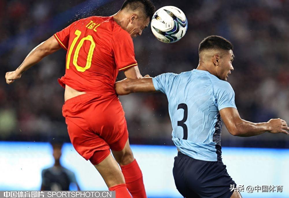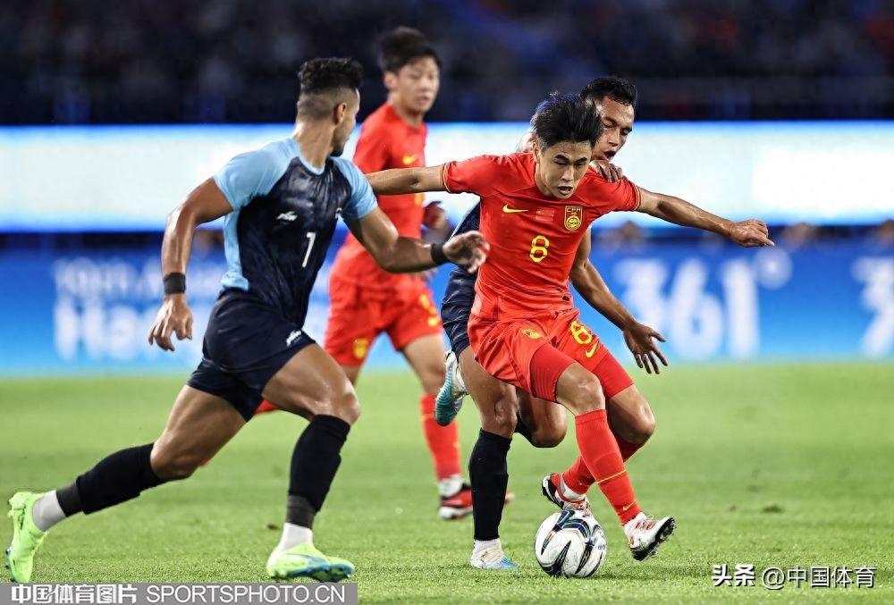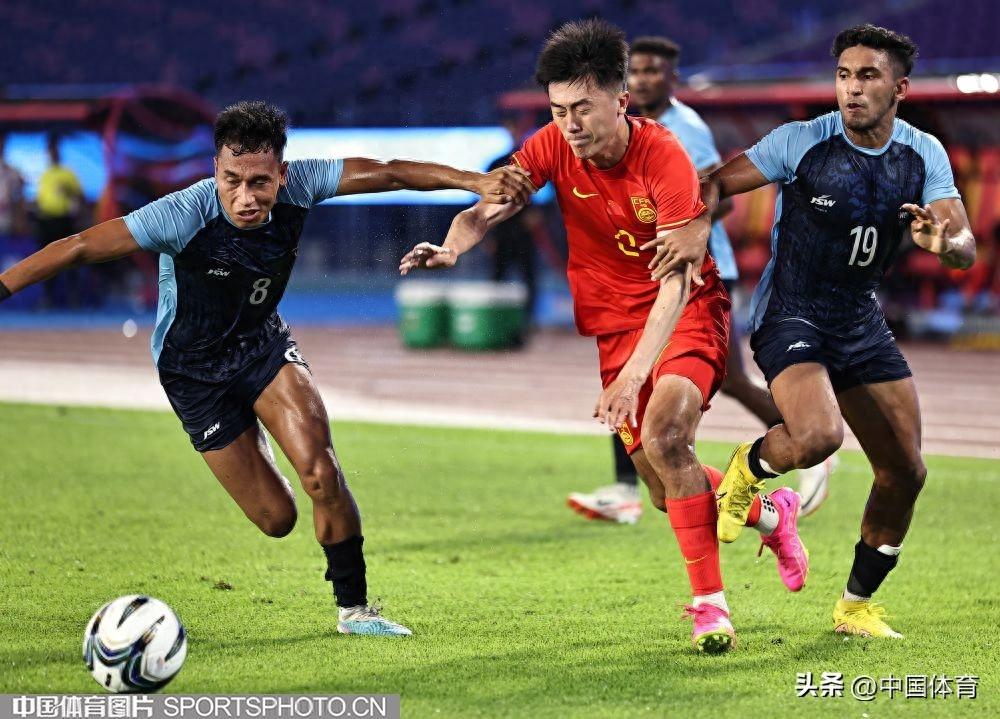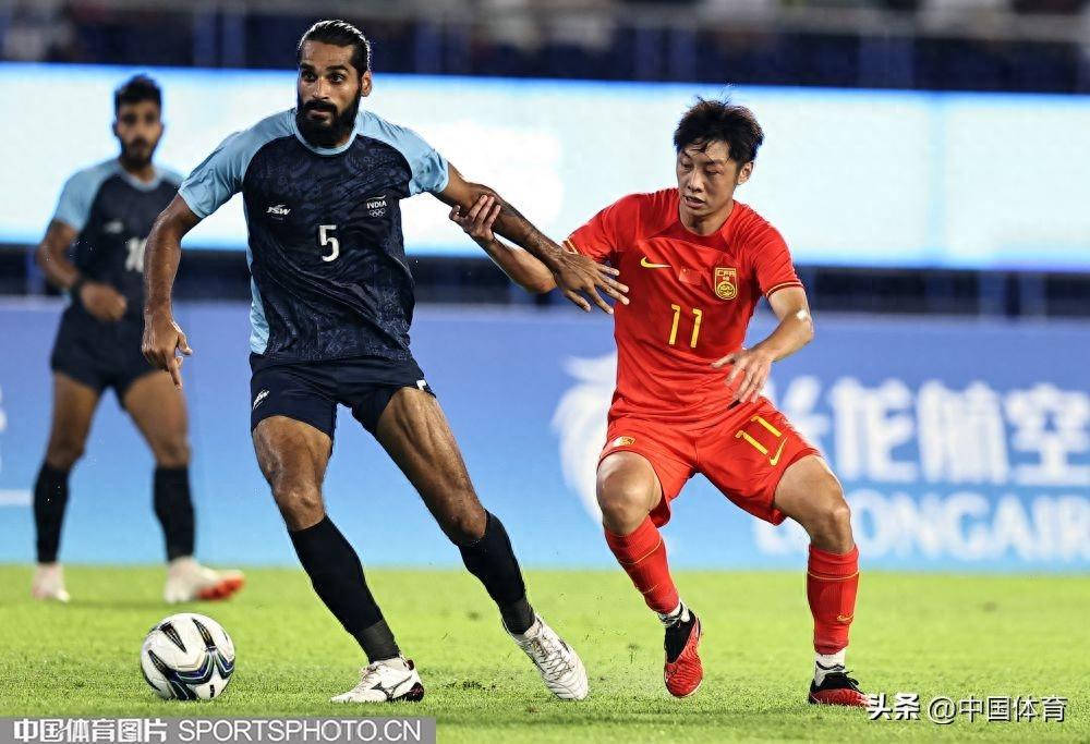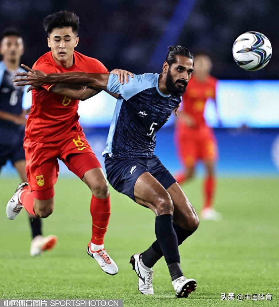 中國體育訊 9月19日,杭州亞運會男子足球小組賽A組比賽在黃龍體育中心體育場開戰。晚間進行的一場比賽中,中國隊以5比1輕取印度隊,取得開門紅。上半場,高天翼率先破門,中國隊1比0領先。隨後朱辰傑罰丟點球,拉胡爾爲印度隊扳平比分;易邊再戰,戴偉浚遠射得手,陶強龍梅開二度,臨近終場方昊破門錦上添花。最終,中國隊以5比1的戰績,收穫小組賽開門紅。(中國體育圖片 王憲民 攝)