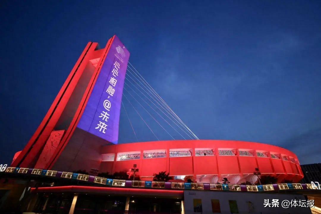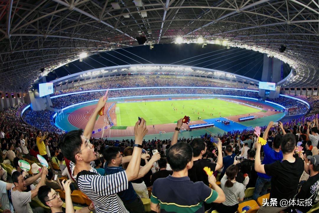 隨着夜幕降臨,伴隨着璀璨的霓虹,黃龍體育中心氣氛逐漸火熱起來,三萬五千餘名觀衆從四面八方前來,表達對國家隊支持的同時,享受期待已久的亞運氛圍;黃龍體育中心這座杭州的“體育地標”在經過升級改造之後也給不少到場的觀衆留下了深刻印象。場館內,以杭州亞運會主形象色“虹韻紫”爲主色的觀衆席,和球場中心“蒼翠綠”的草坪相映成趣。沿着色彩斑斕的看臺,兩條寫有“心心相融,@未來”的環屏如兩條藍絲帶環繞在場地四周。