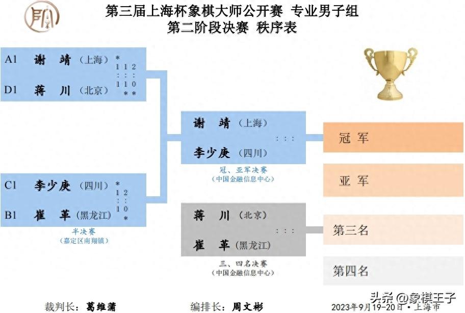 男子3、4名蔣川對崔革,女子3、4名趙冠芳對沈思凡,3、4名賽20日下午一點半進行。象棋王子全程直播。