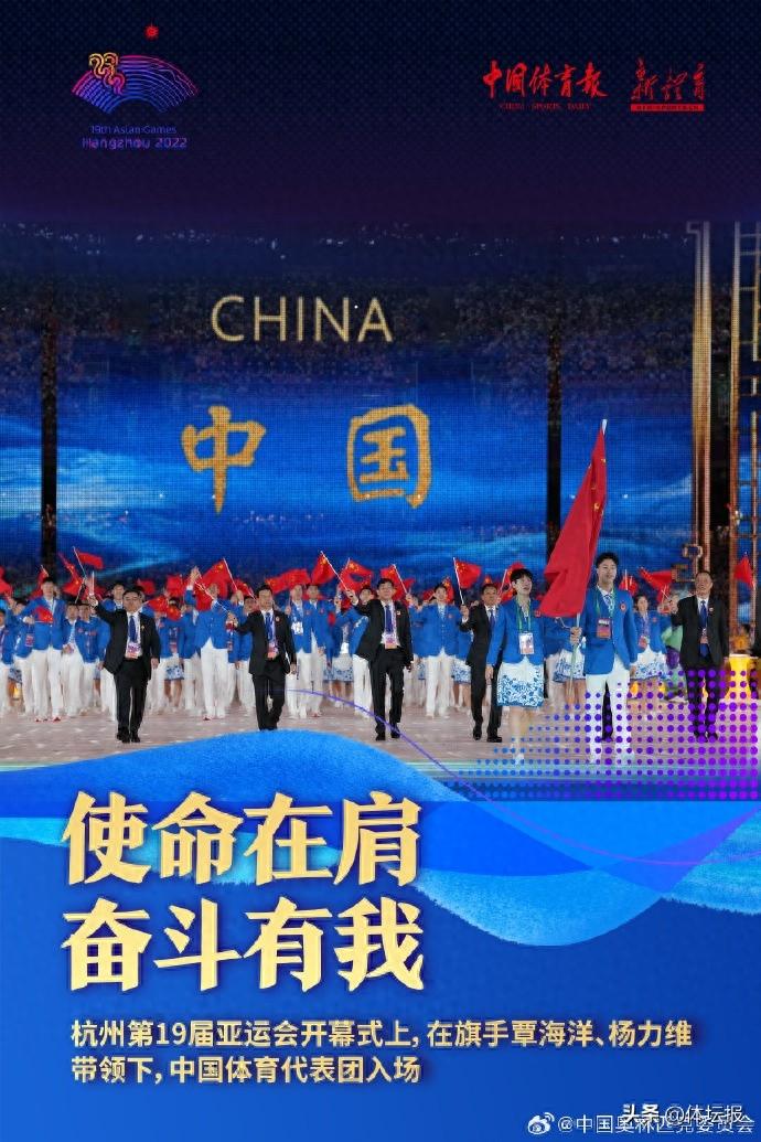 “四君子”梅、蘭、竹、菊點綴下的星光大道,數萬名現場觀衆的齊聲歡呼。在杭州奧體中心璀璨燈光映照下,運動員入場式將整臺開幕式的氣氛推向了高潮。在歌曲“歌唱祖國”的鋪墊下,東道主中國隊壓軸出場。打頭陣的在旗手覃海洋和楊力維合力擎起五星紅旗,邊走邊向場邊揮手致意。