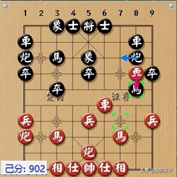 紅方車二退一,提車拿起黑馬即喫去,待得黑炮8平7,平炮想打紅棋底相,魔童巧手車二退五,逃車解殺。