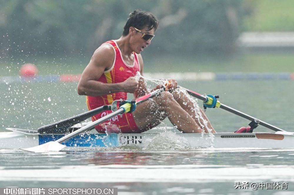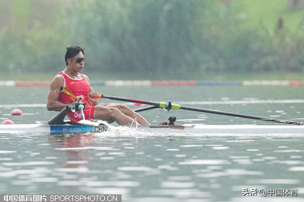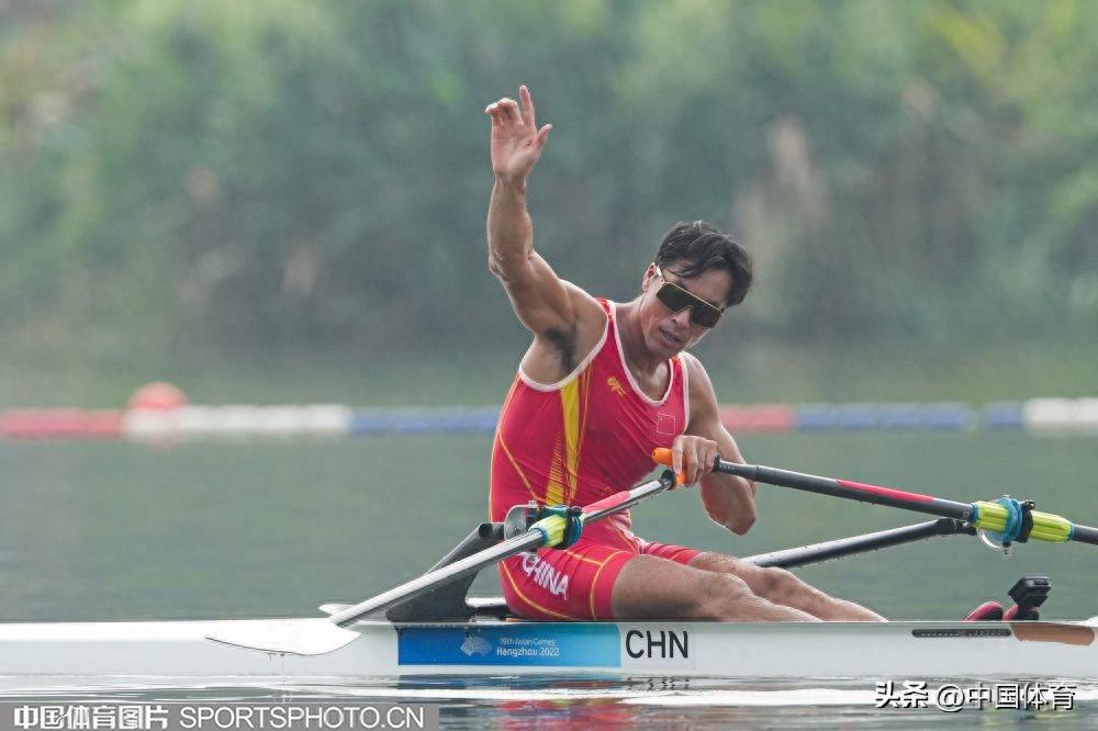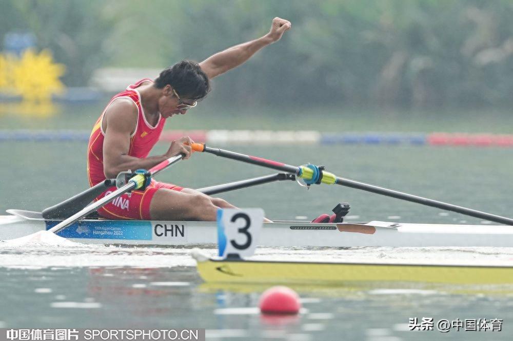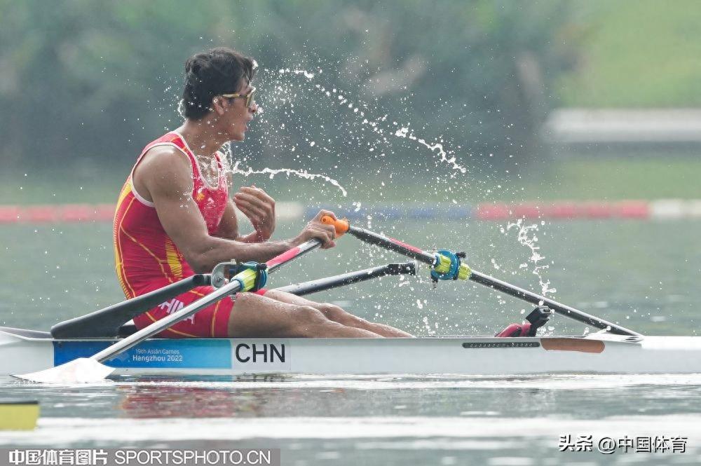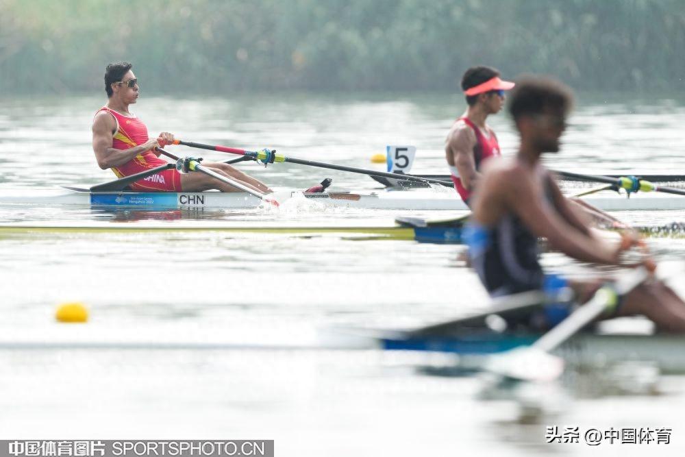 中國體育訊 9月25日,在杭州亞運會賽艇男子單人雙槳決賽中,中國選手張亮以6分57秒06的成績獲得冠軍。日本選手荒川龍太以6分59秒79收穫銀牌,中國香港選手趙顯臻排名第三位。 圖爲張亮在比賽中。(中國體育圖片 倪敏哲 攝)