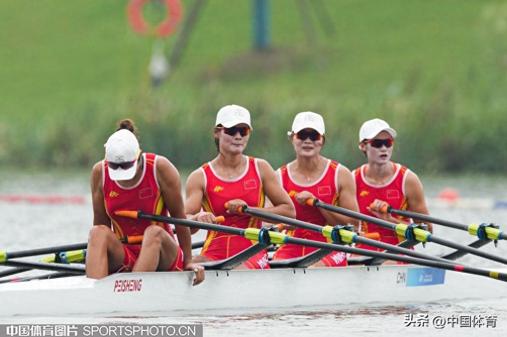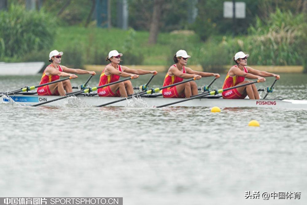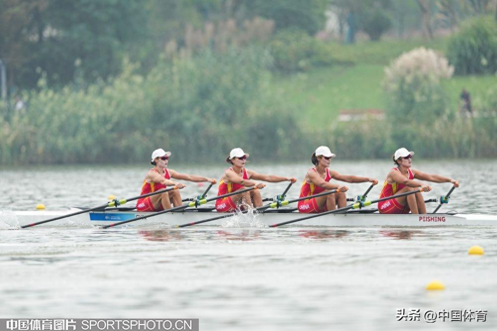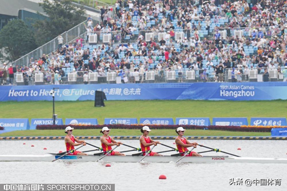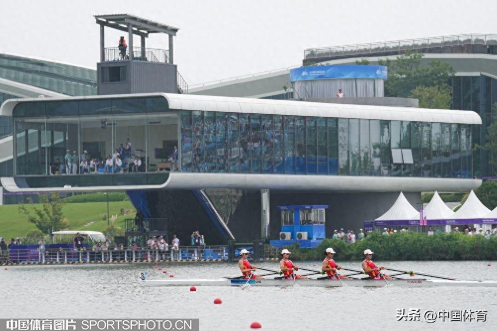 中國體育訊 9月25日,杭州亞運會賽艇女子四人雙槳決賽A組的比賽,在杭州富陽水上運動中心舉行。由陳雲霞、張靈、呂揚、崔曉桐組成的中國隊以6分42秒84的成績獲得冠軍。伊朗隊和越南隊分獲銀牌和銅牌。圖爲比賽場景。(中國體育圖片 倪敏哲 攝)