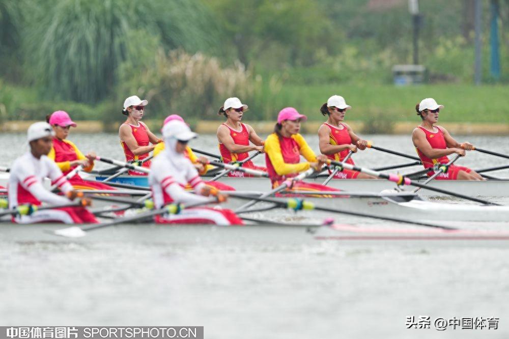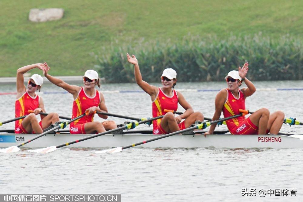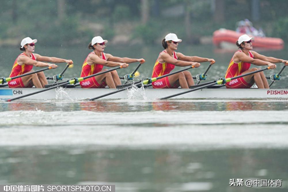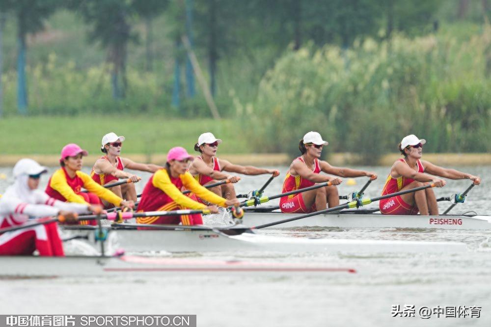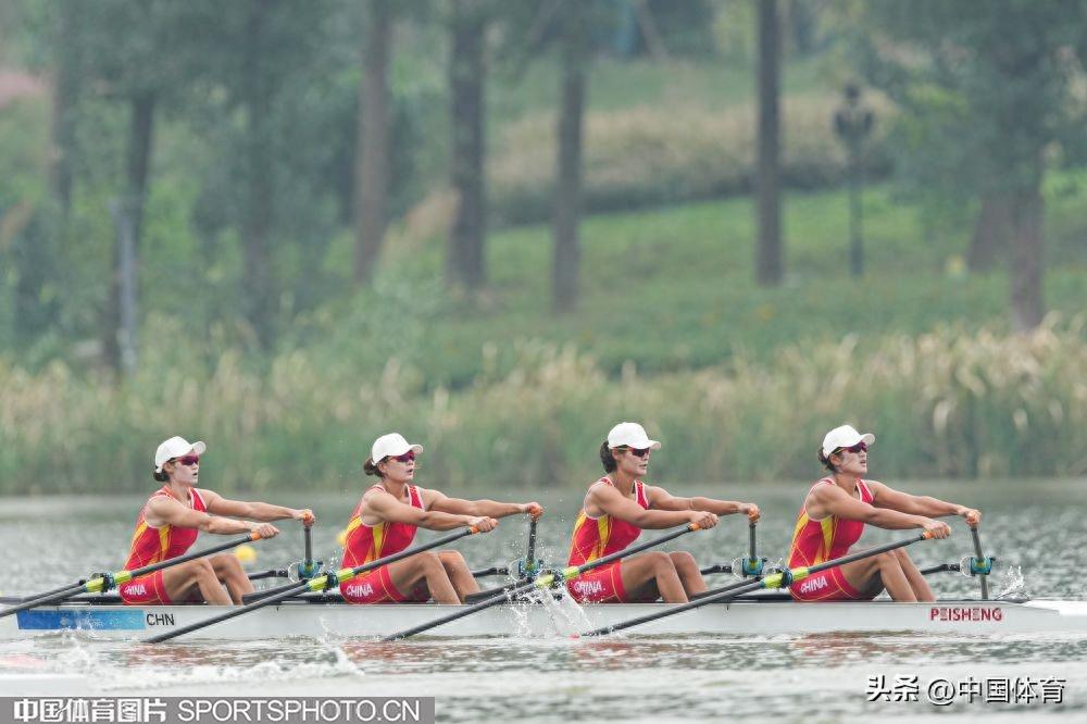 中國體育訊 9月25日,杭州亞運會賽艇女子四人雙槳決賽A組的比賽,在杭州富陽水上運動中心舉行。由陳雲霞、張靈、呂揚、崔曉桐組成的中國隊以6分42秒84的成績獲得冠軍。伊朗隊和越南隊分獲銀牌和銅牌。圖爲比賽場景。(中國體育圖片 倪敏哲 攝)