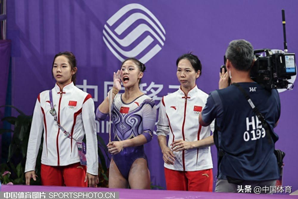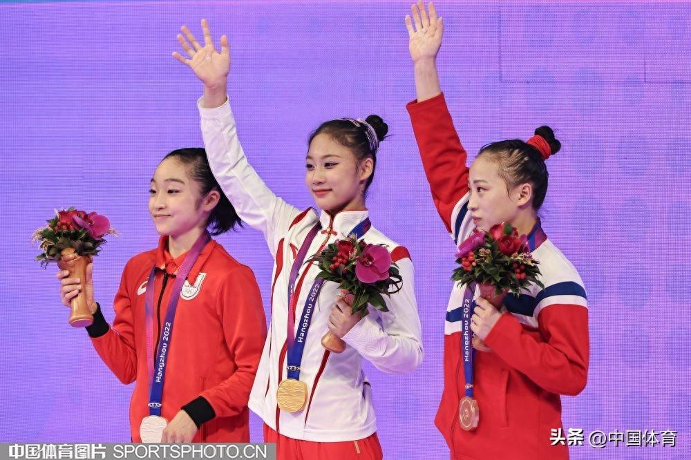 中國體育訊 9月27日,杭州第19屆亞運會競技體操女子全能決賽在黃龍體育中心體育館舉行。中國選手左彤以53.565分獲得金牌,爲中國體操隊贏得了該項目上的第13枚金牌。日本選手岡村真和朝鮮選手金水晶分獲銀牌和銅牌。另一位中國選手章瑾以50.899分排名第四位。(中國體育圖片 王憲民 攝)