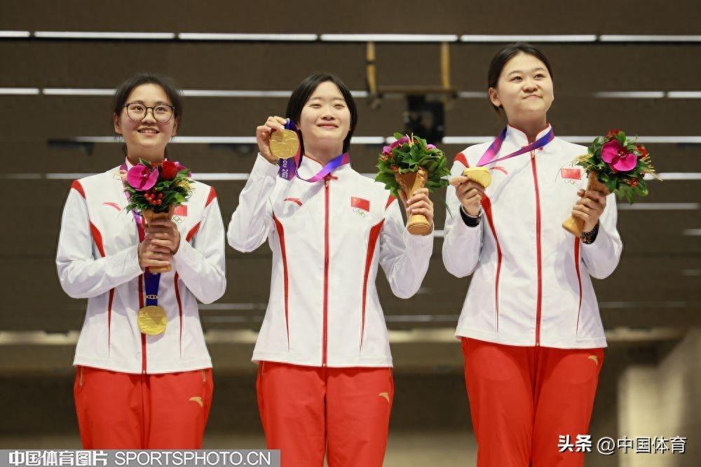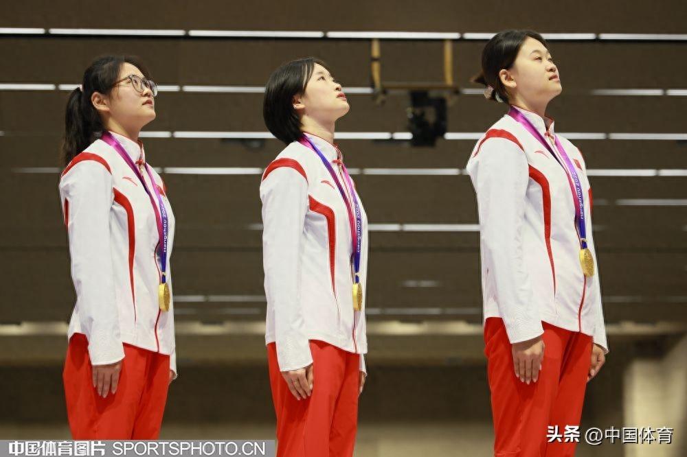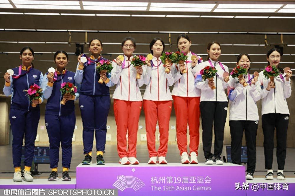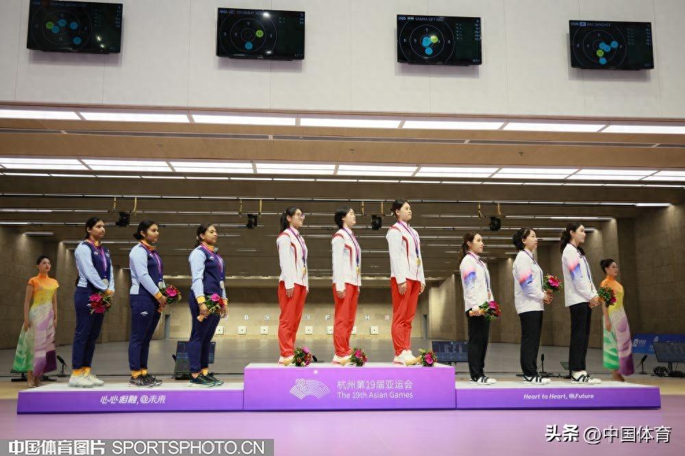 中國體育訊 9月27日,杭州亞運會射擊女子50米步槍3種姿勢團體決賽在杭州射擊決賽館進行。由三位“00後”選手韓佳予、夏思鈺、張瓊月組成的中國隊以1773環的成績,獲得金牌。印度隊獲得銀牌,韓國隊獲銅牌。(中國體育圖片 鹿麟 攝)(左起)韓佳予、夏思鈺和張瓊月在頒獎儀式上頒獎儀式現場頒獎儀式現場頒獎儀式現場