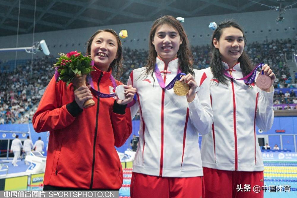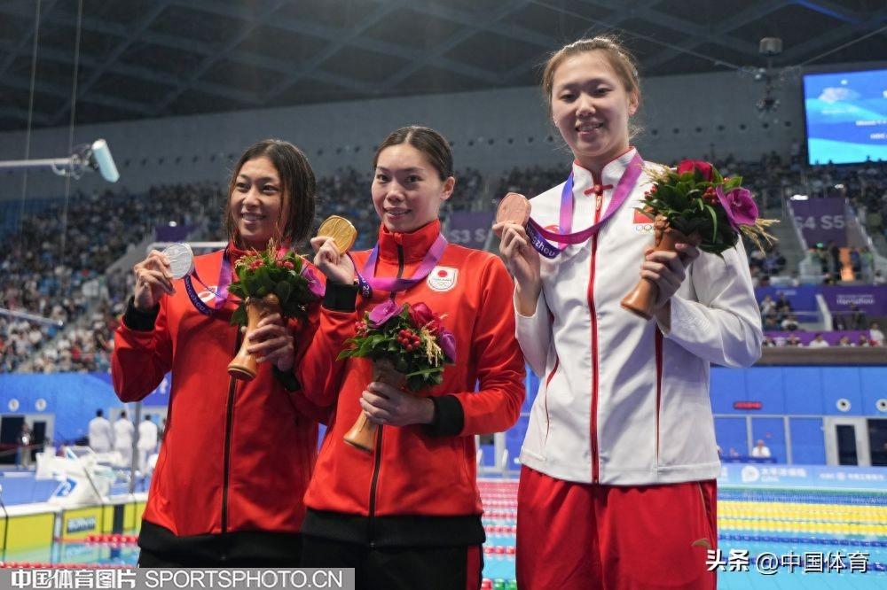 冠軍張雨霏(中)、亞軍日本選手相馬愛(左)和王一淳在頒獎儀式上
