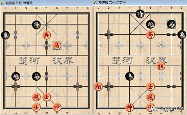 鄭惟桐全速爭取進擊的路線,黃學謙守的陣勢工穩,滴水不漏,紅無辦法,再次交換後,形成馬炮雙兵仕相全對馬炮卒士象全的局面。