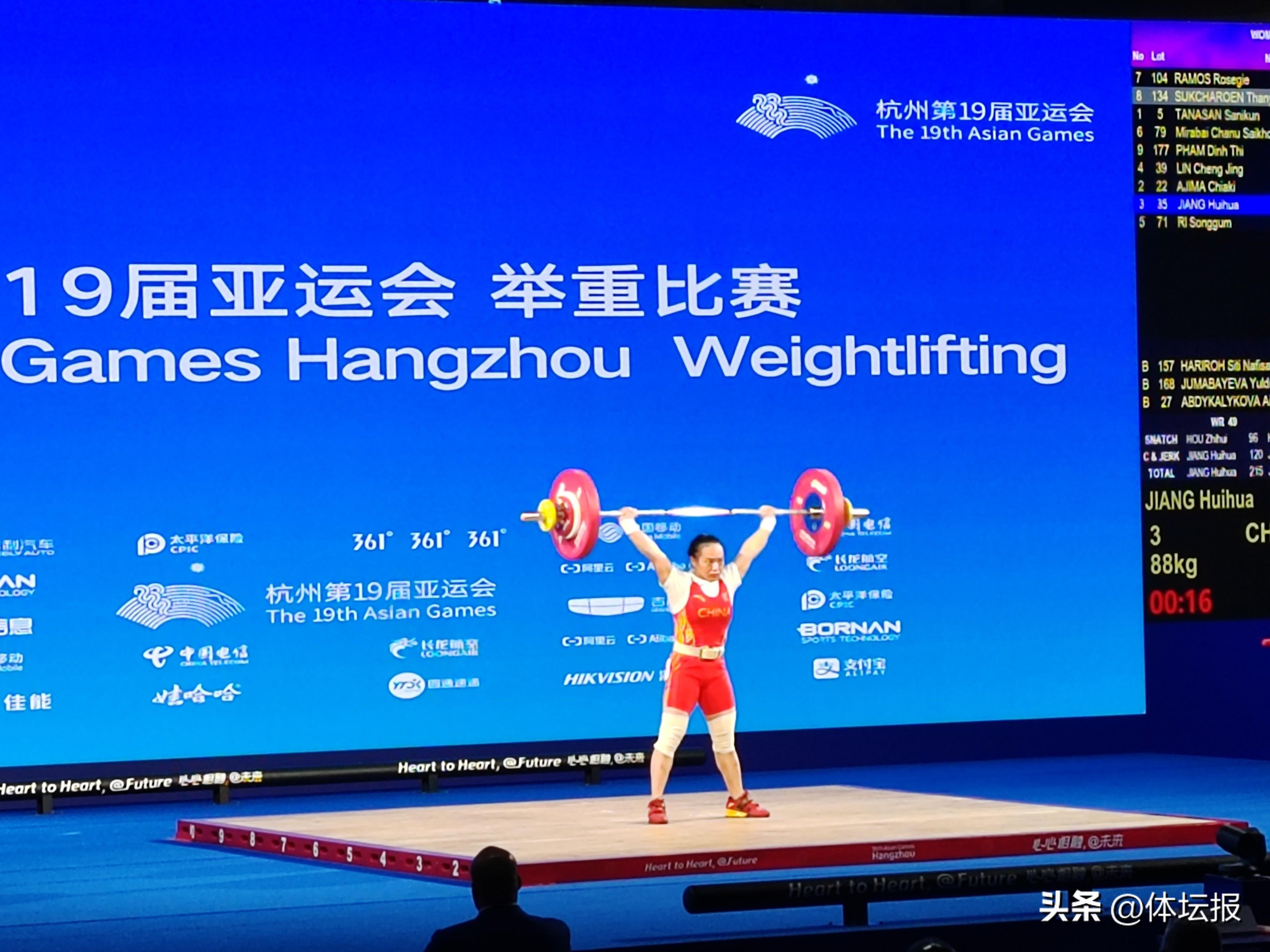 在抓舉階段,蔣慧花第一次試舉就要了88kg的重量,並且一次成功。第二次試舉,蔣慧花將重量增加至92kg,再次一舉成功,並且打破亞運會女子抓舉紀錄。隨後,蔣慧花繼續發力,將重量增加至94kg,並再次成功,刷新了自己剛剛創下的紀錄,也讓她順利拿下抓舉比賽。