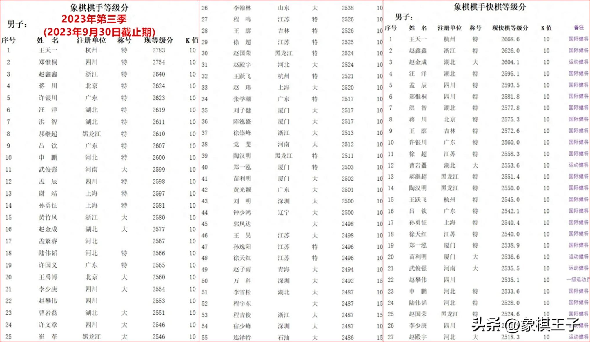 同日,官方發佈了2023年第三季象棋棋手等級分排行榜,棋壇第一高手、連續十年等級分全國第一、外星人王天一以慢棋2783,快棋2668.6。
