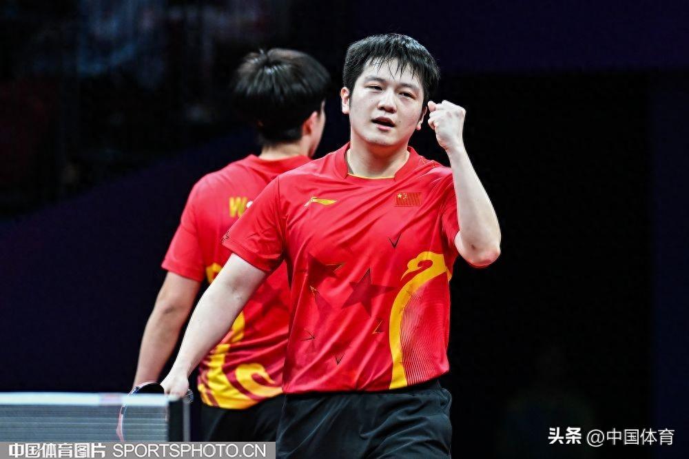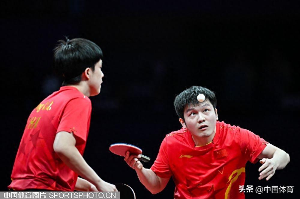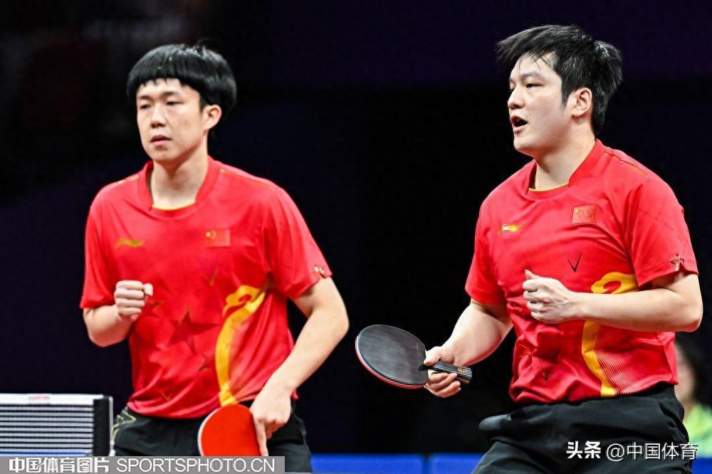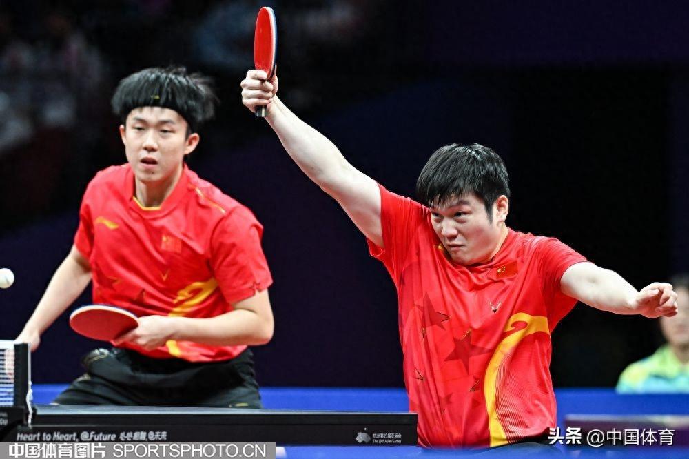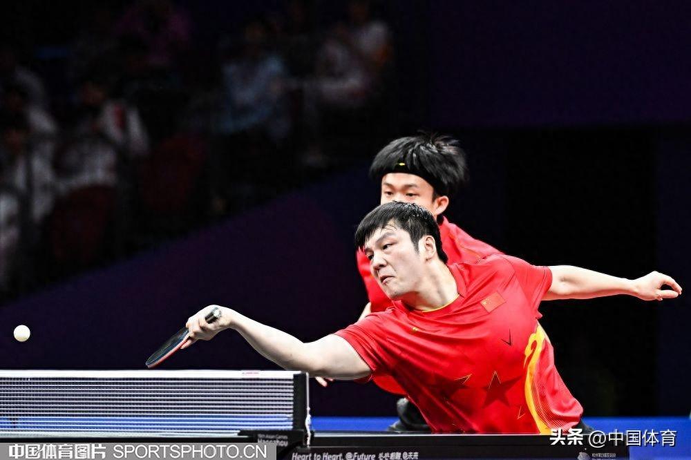 中國體育訊 10月1日晚,在杭州亞運會乒乓球男子雙打決賽中,中國組合樊振東/王楚欽以4比0橫掃韓國組合張禹珍/林鐘勳,獲得金牌。四局比分爲11比6、11比8、11比7和11比3。(中國體育圖片 白宇 攝)