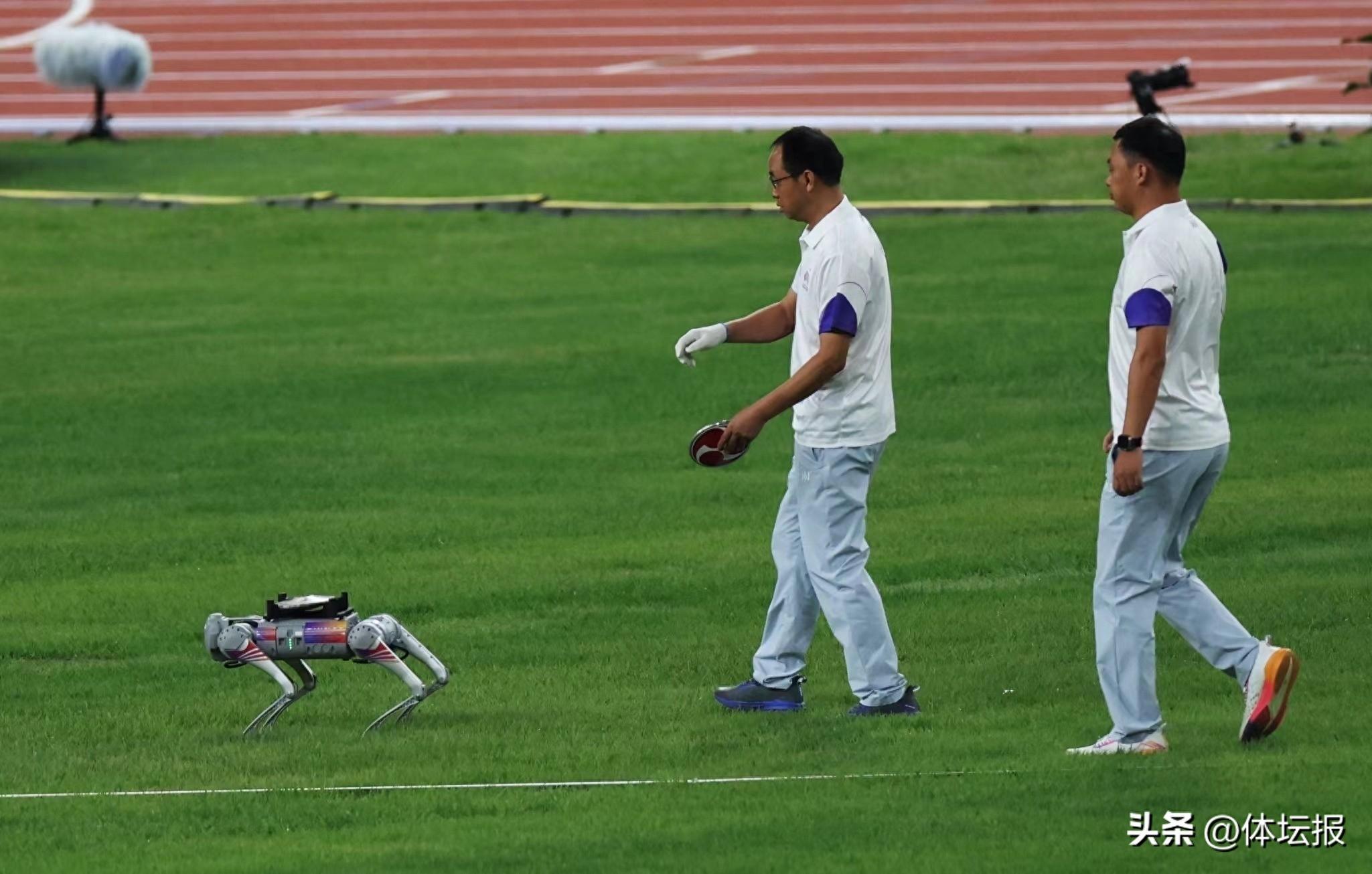 據悉,此批投放亞運賽場機器狗與人慢跑速度無異,身背裝有卡槽,可承受1-2公斤的標準鐵餅,工作人員只需將運動員擲出的鐵餅卡在機器狗身上的卡槽,機器狗便可靈活往返於起終點之間,平均距離100餘米,整場比賽可代替人工往返距離7000餘米,省時又省力。