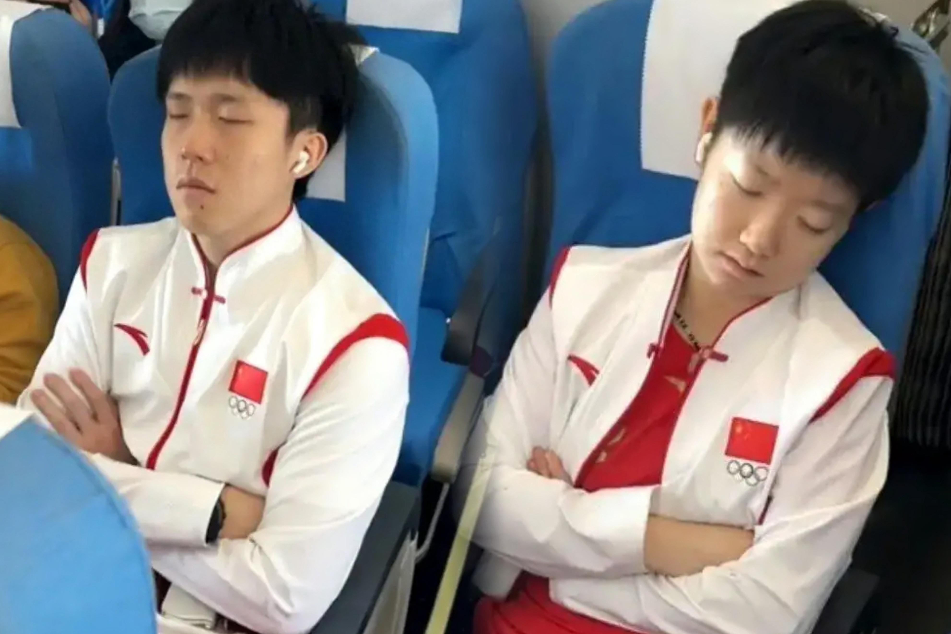 有網友在杭州蕭山國際機場遇見國乒,他們從杭州出發,前往蘭州參加WTT球星挑戰賽,王楚欽和孫穎莎被拍到在飛機上小憩的畫面,看來是真的很累了。