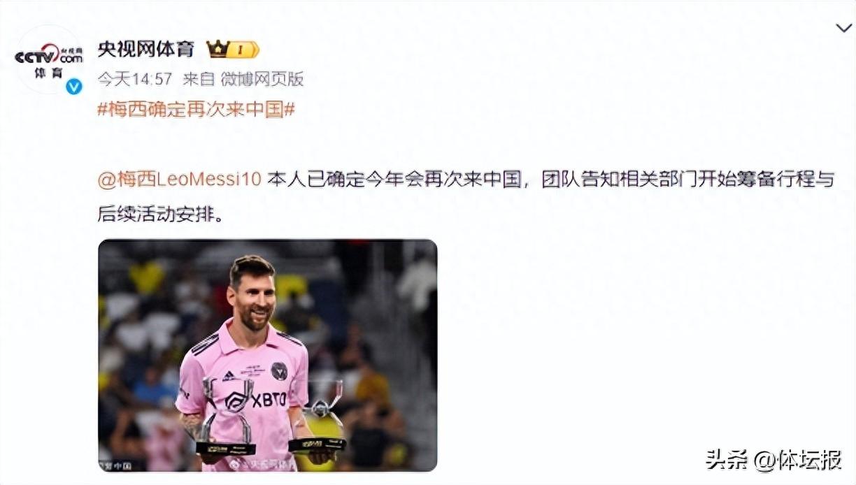 而在梅西加盟邁阿密國際之後,圍繞他的每一次登場、每一場比賽也是話題不斷。10月9日下午,濱巖再次轉發了上面這條微博,並表示:“穿粉色球衣,30號法國巴黎取點東西,5號中國!”這也被認爲是暗示梅西將隨邁阿密國際訪華。