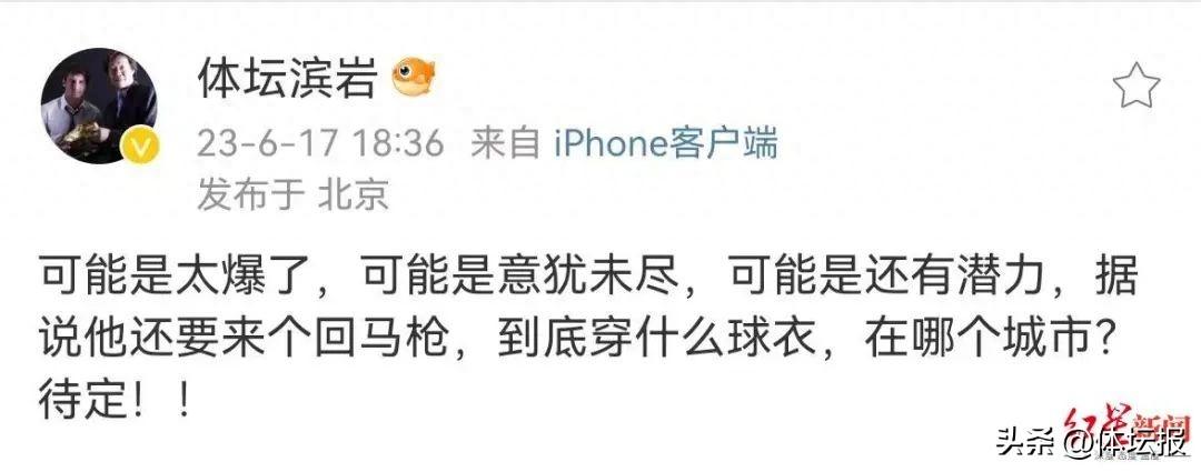 著名國際足球記者、在西班牙足壇擁有廣泛人脈的濱巖在今年6月曾發微博表示:“可能是太爆了,可能是意猶未盡,可能是還有潛力,據說他還要來個回馬槍。到底穿什麼球衣,在哪個城市?待定!”