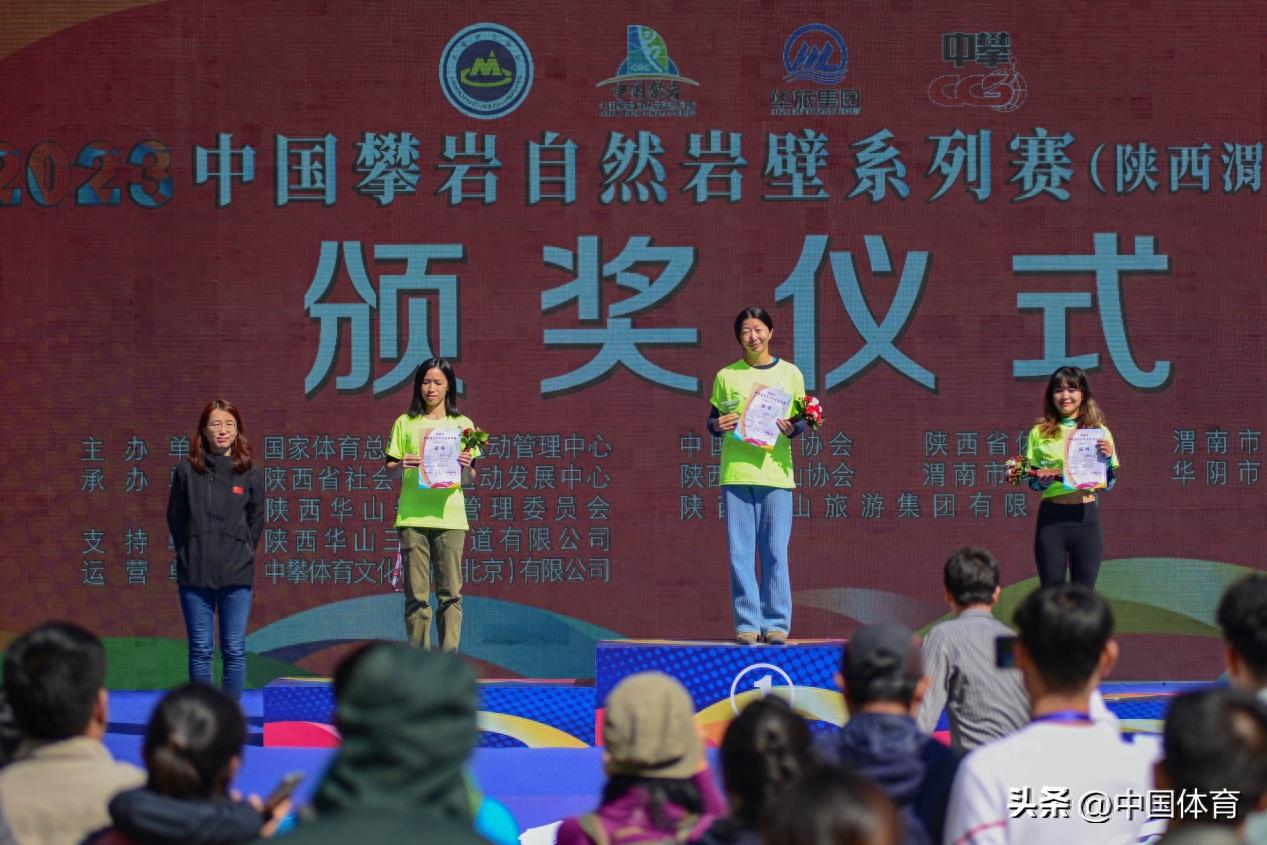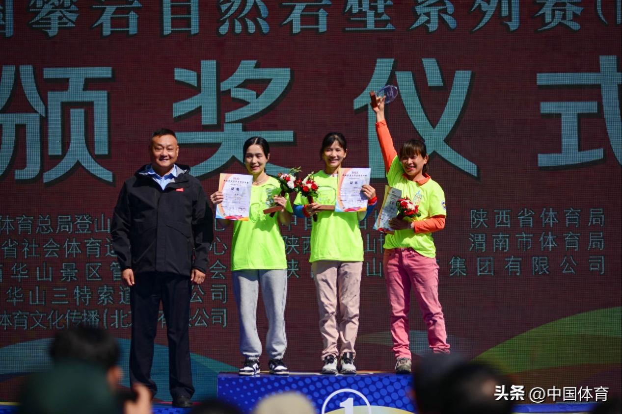 華旅集團華山戶外運動基地總經理杜焱鑫爲女子專業組黃偉君、鍾裕、盧春鳳頒獎