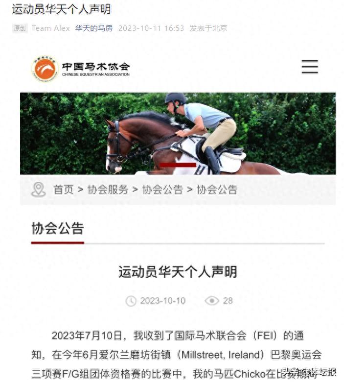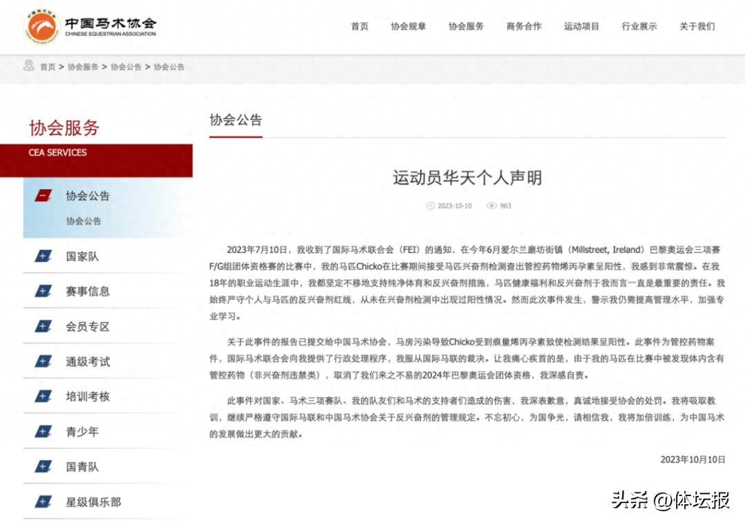 剛剛在杭州亞運會馬術比賽中拿下馬術三項賽個人賽和團體賽兩枚金牌的中國騎手華天,10月10日在中國馬術協會官方網站發佈了一則聲明。