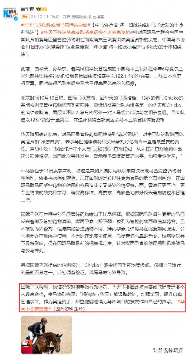 華天在聲明中說,賽後,2023年7月10日,他收到了國際馬術聯合會(FEI)的通知,稱他的馬匹Chicko在比賽期間接受馬匹興奮劑檢測查出管控藥物烯丙孕素呈陽性。華天聲明稱,“是馬房污染導致Chicko受到痕量烯丙孕素致使檢測結果呈陽性”。記者瞭解,所謂痕量是指“含量低於百萬分之一的極微量”。