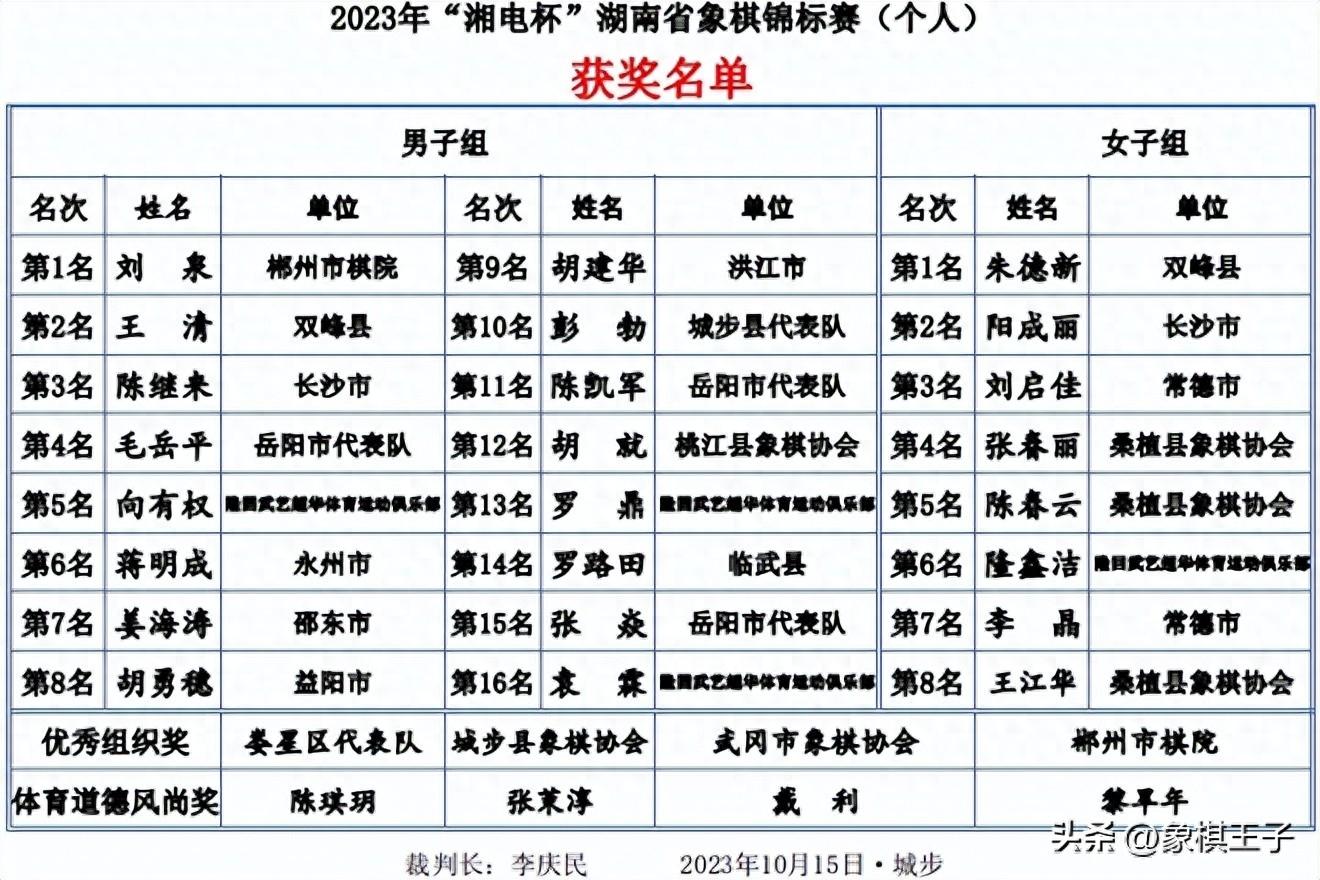 10月15日,2023年“湘電杯”湖南省象棋個人錦標賽在邵陽城步火線收兵,男子組九十六將,執行7+2制,7輪後前四淘汰戰,女子十二人7輪積分。