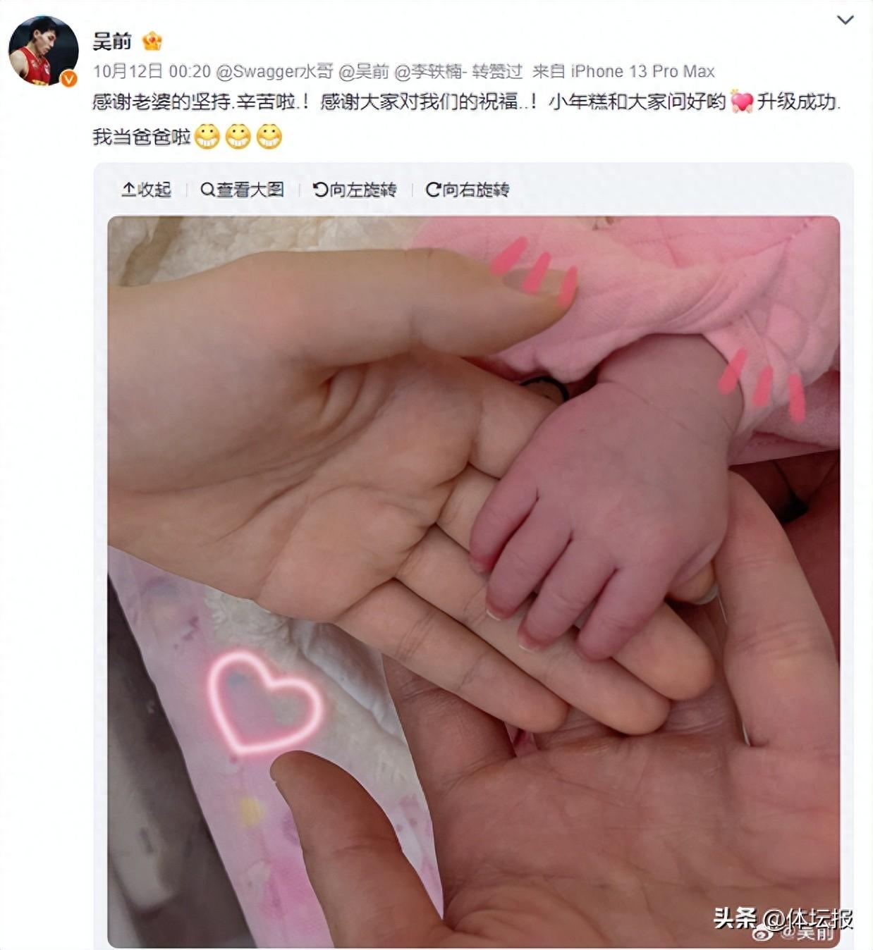 就在前不久,稠州金租男籃隊長吳前宣佈自己喜得貴子,成功升級當了爸爸:“責任更大了,無論是工作還是生活都會全力以赴。”