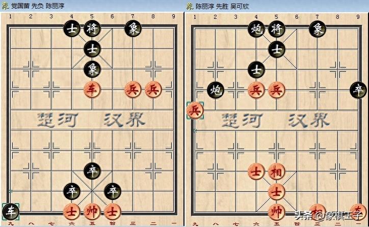 陳麗淳後手車3卒士象全對車雙兵雙仕,擊敗雲南棋後黨國蕾,車三兵對雙炮,取勝新晉亞洲冠軍吳可欣。