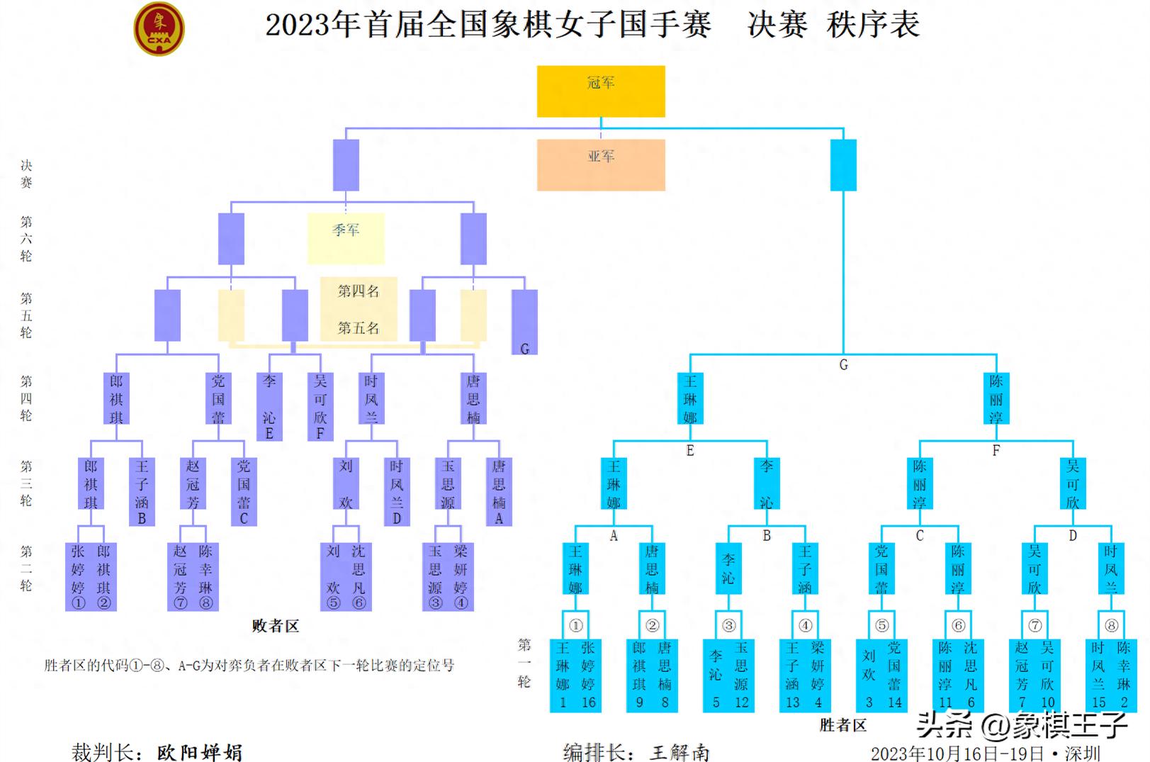 比賽18日上午九點勝者組決戰,敗者6進4,下午三點敗者4進2;19日上午九點敗者復活決勝,下午兩點冠軍總決戰,象棋王子全程直播。