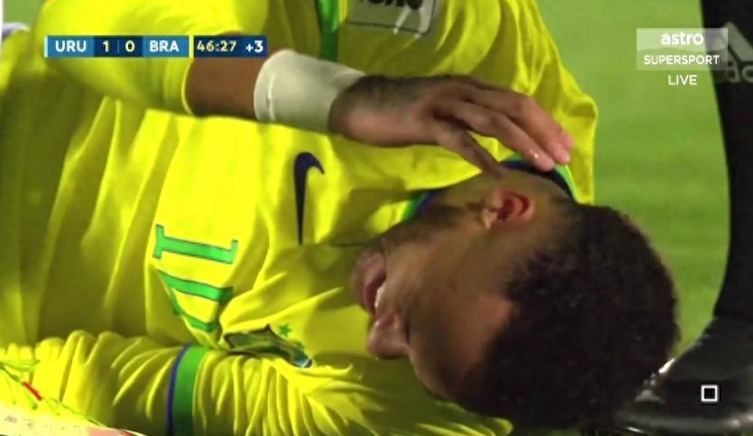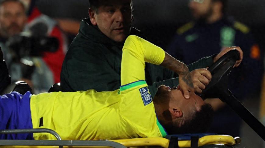 在上半場補時階段,內馬爾與烏拉圭球員德拉克魯斯相撞,左膝扭傷。內馬爾無法堅持比賽被擔架抬離球場,痛哭流淚,看得出來這次受傷內馬爾的狀況並不樂觀,可能他自己也知道傷到什麼程度了,表情極爲痛苦,掩面哭泣,甚至還被擔架車第一時間抬離球場,目前關於內馬爾的傷情還沒有通報。